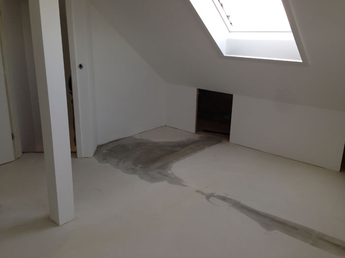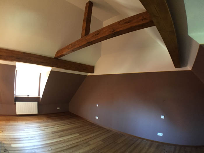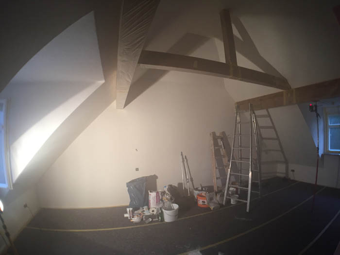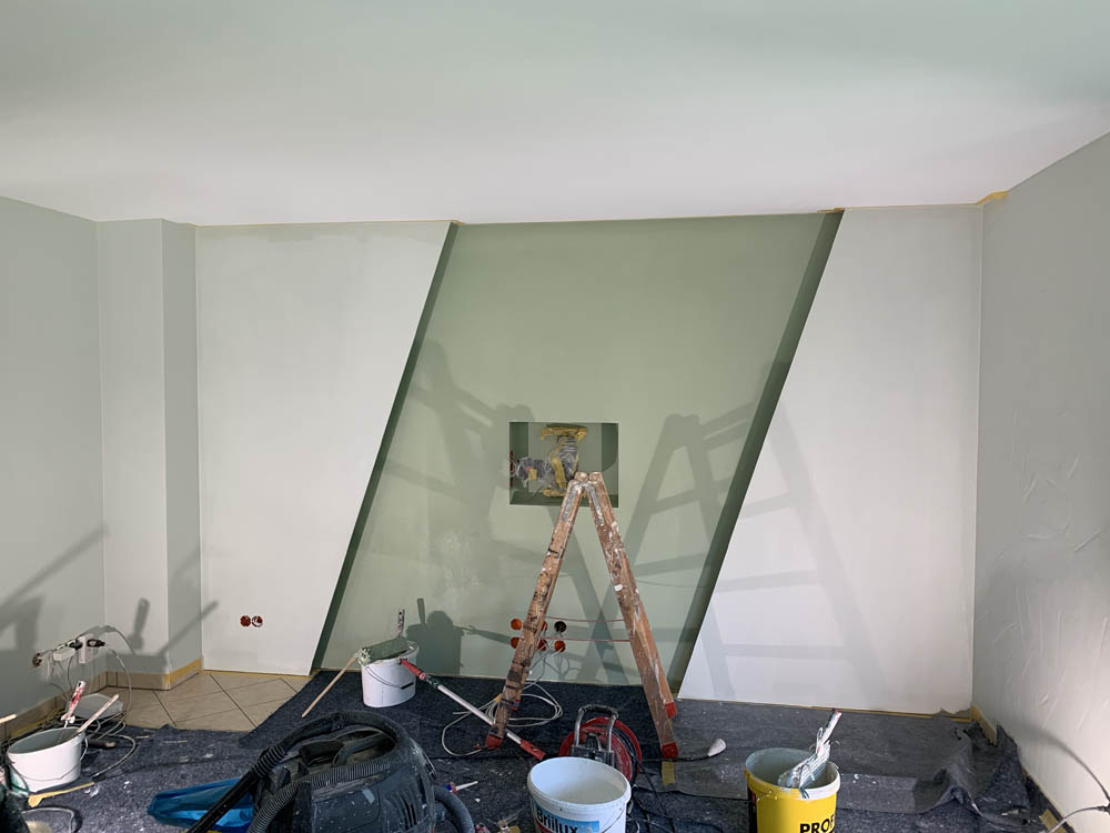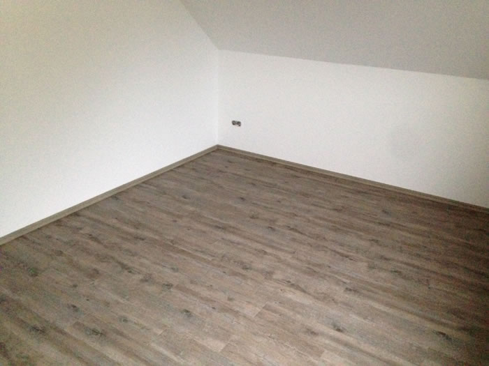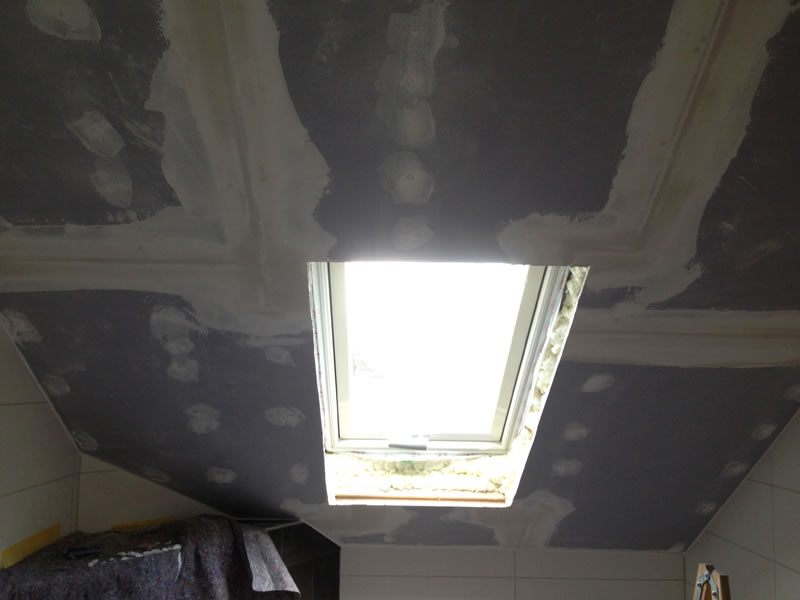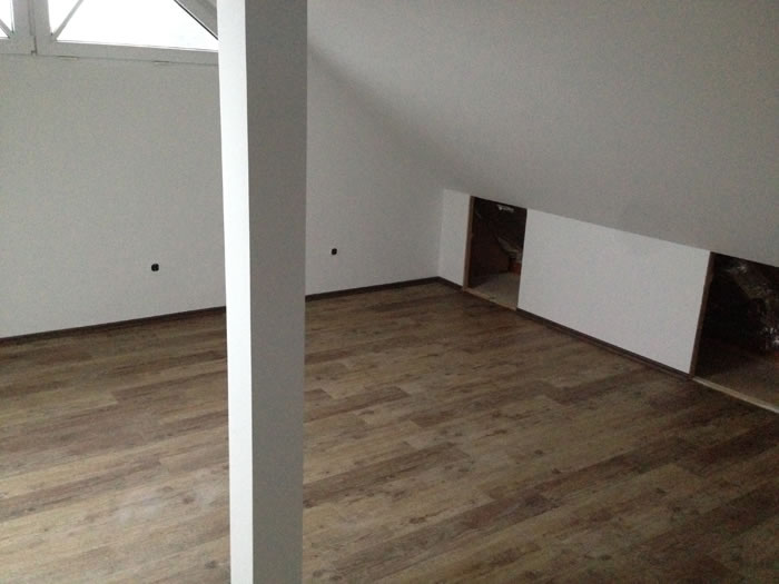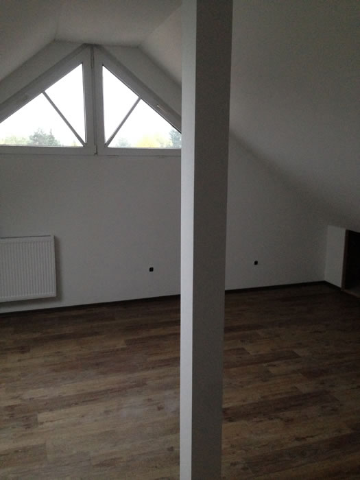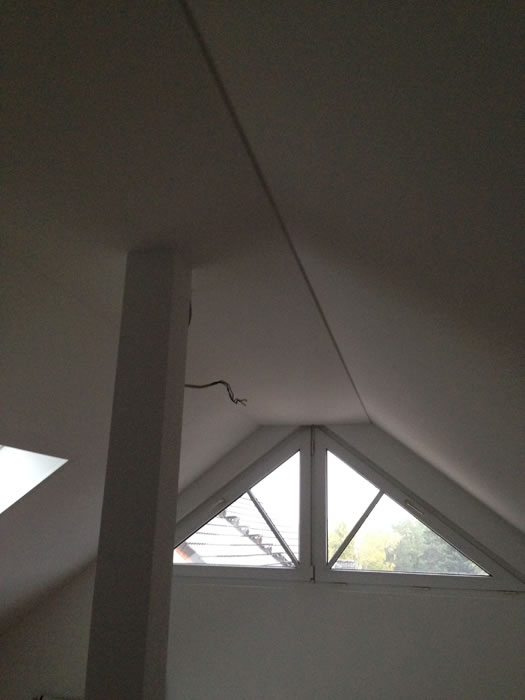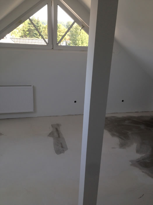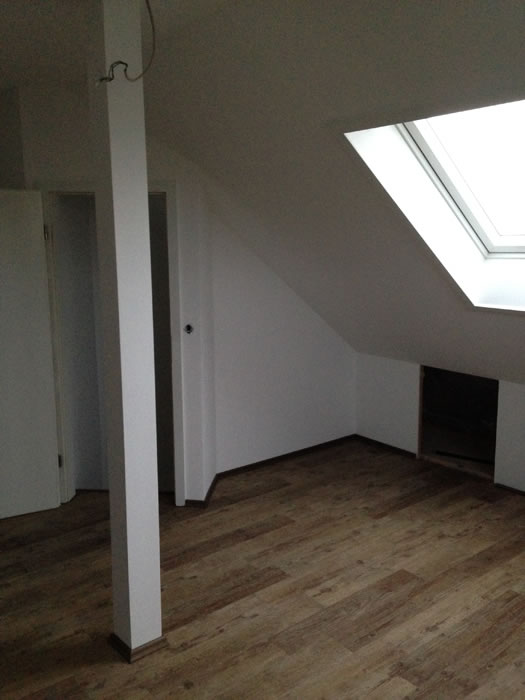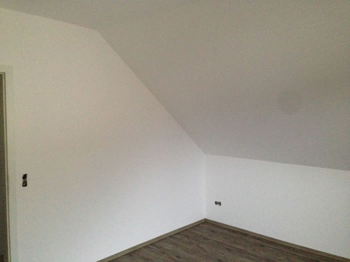 Dachstuhlausbau: Wände mit Rigips verkleiden und spachteln. Mit Backroundvlies tapezieren und mit Caparol Indeko Plus weiß streichen.