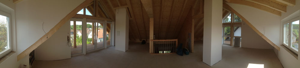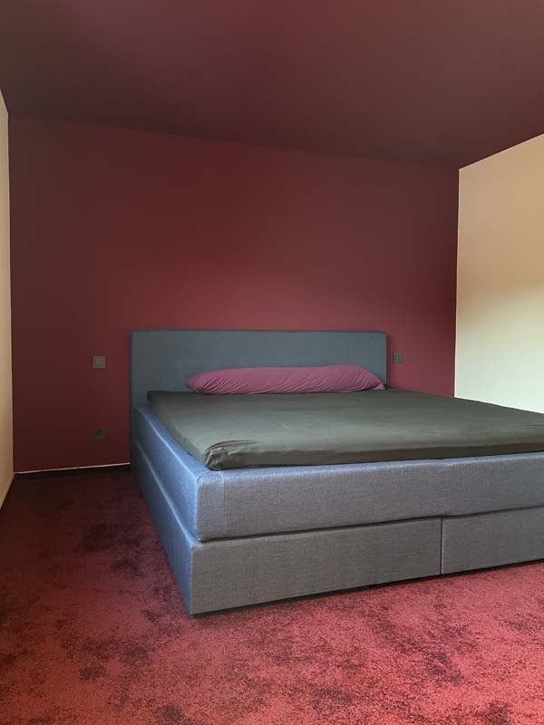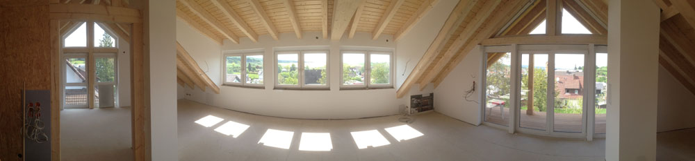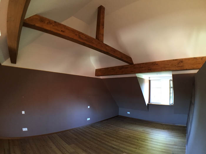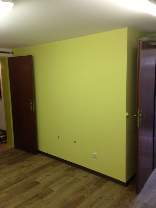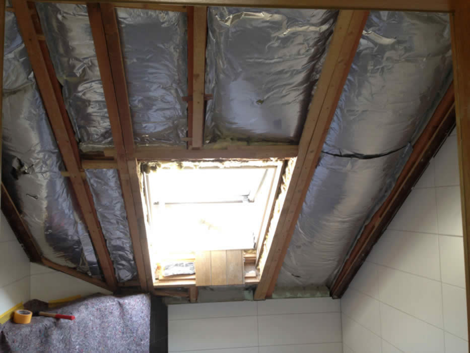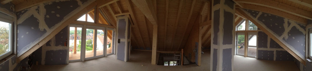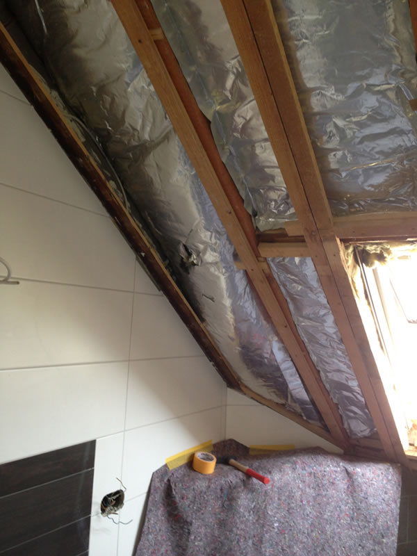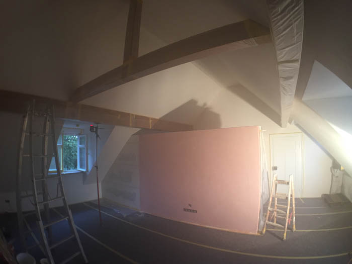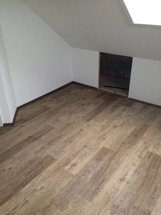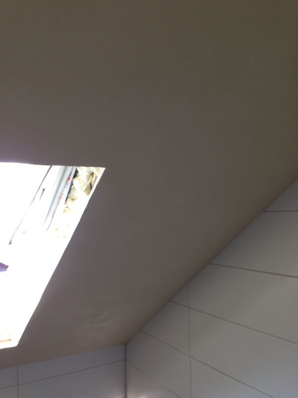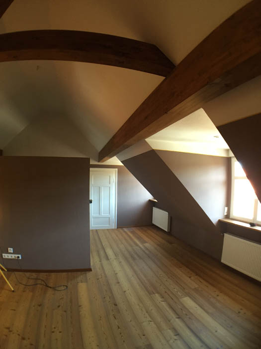 Dachstuhlausbau: Wände mit Rigips verkleiden und spachteln. Mit Backroundvlies tapezieren und mit Caparol Indeko Plus weiß streichen.