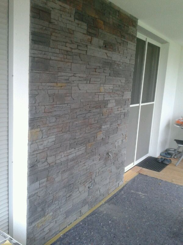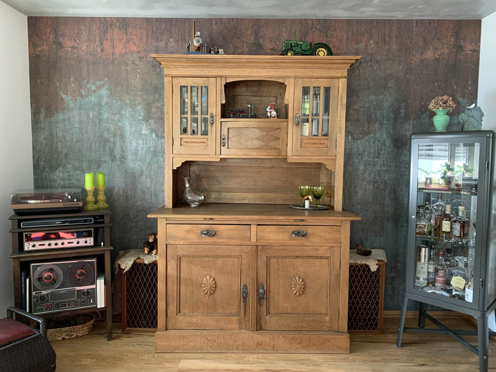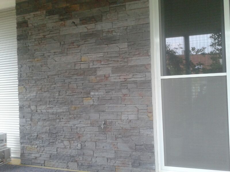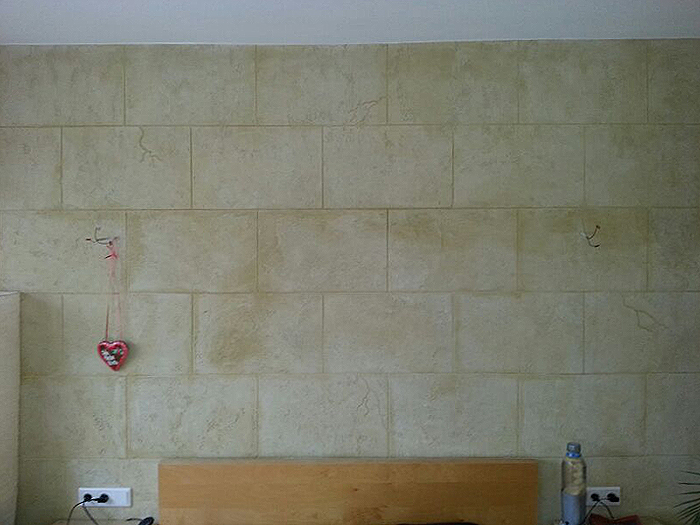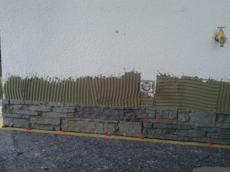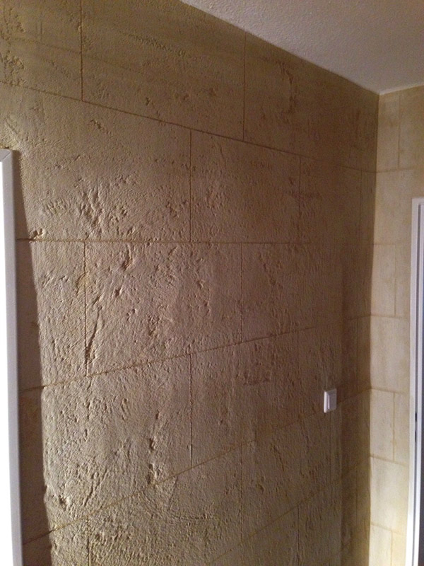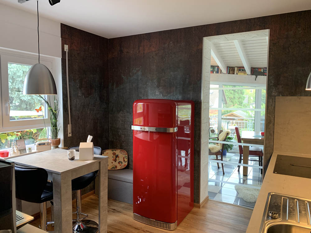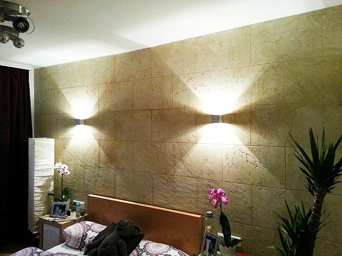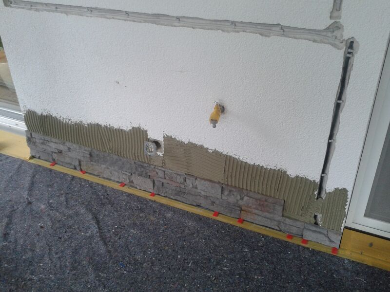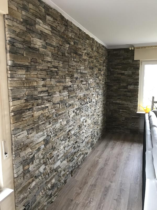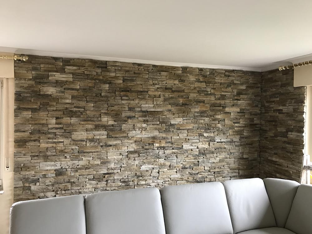 Die Tapete an den Wänden wurde entfernt und die Wände gespachtelt. Anschließend wurden die Klinker vollflächig an den beiden Wänden verklebt.
