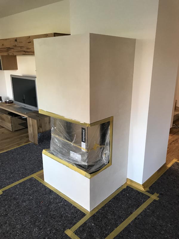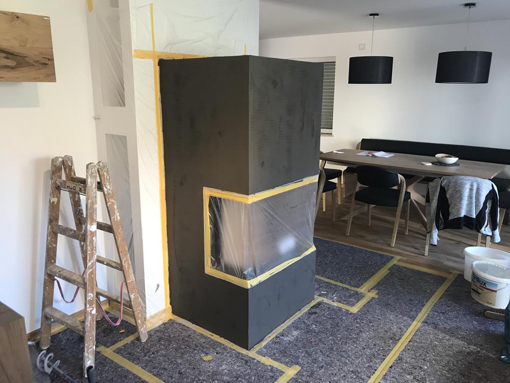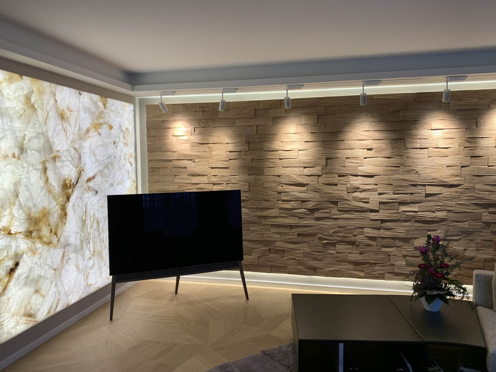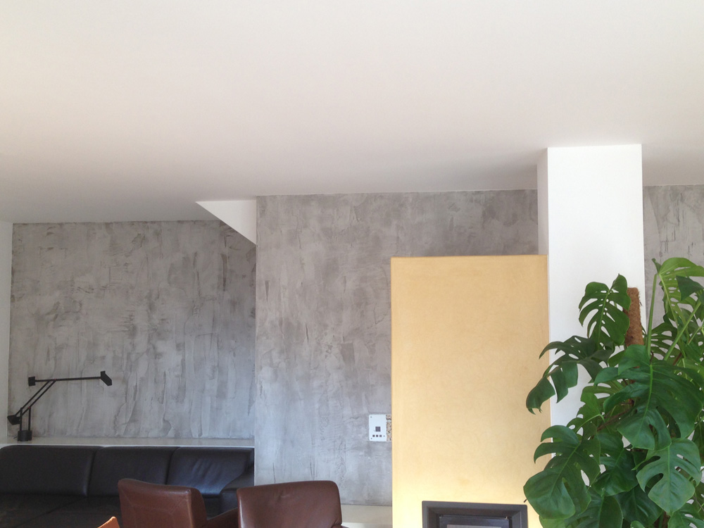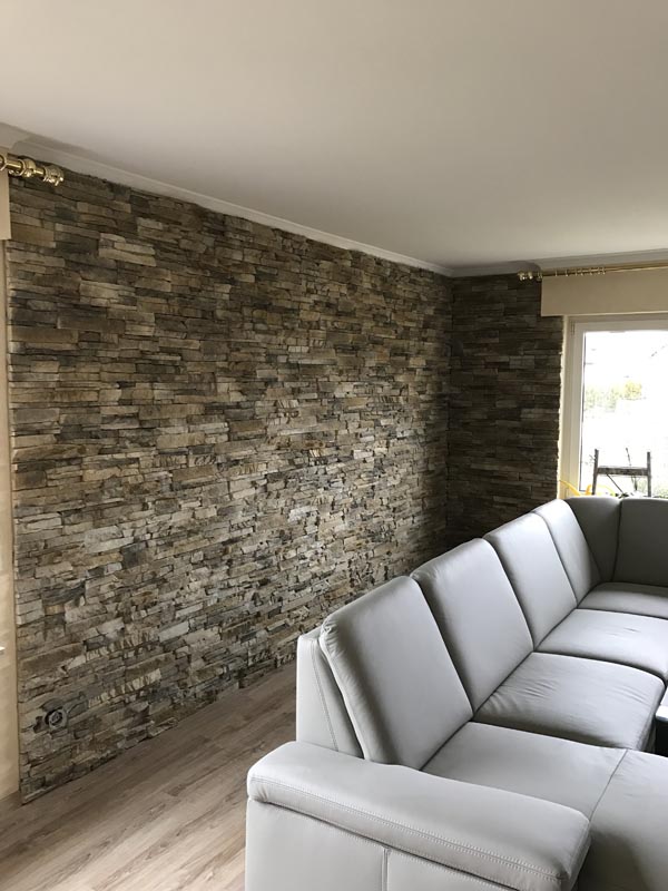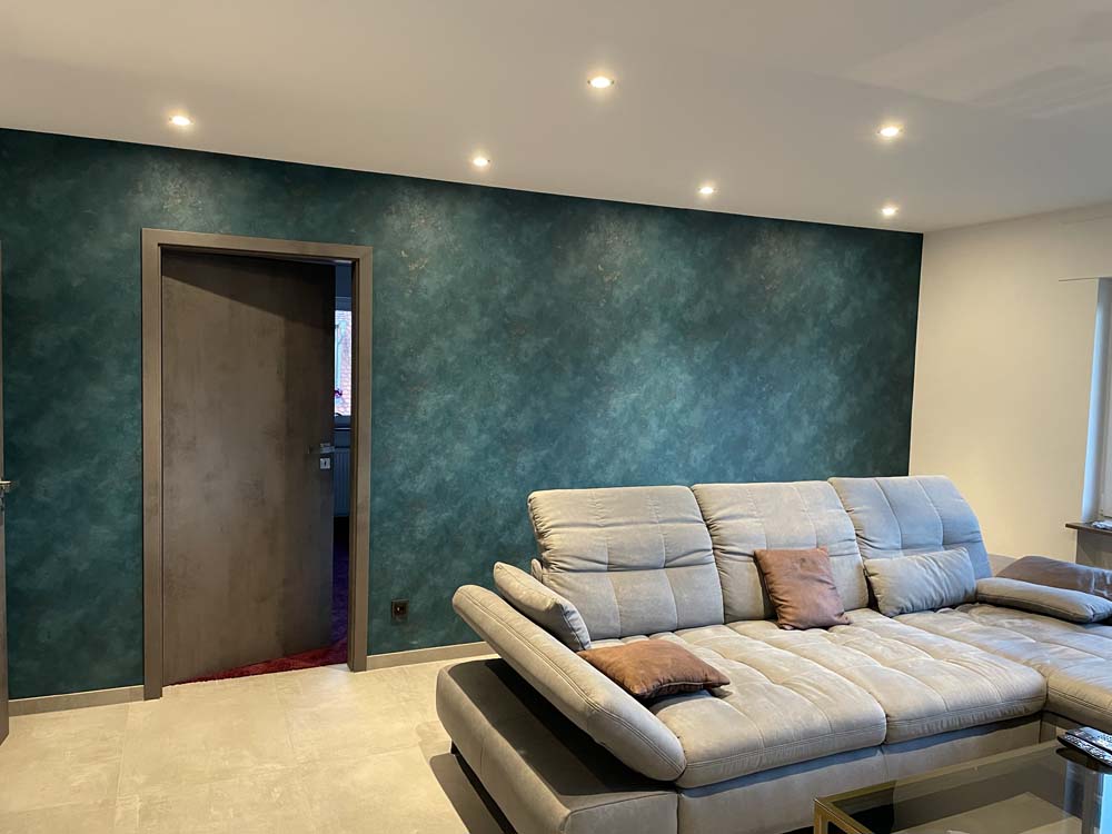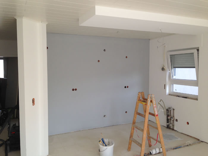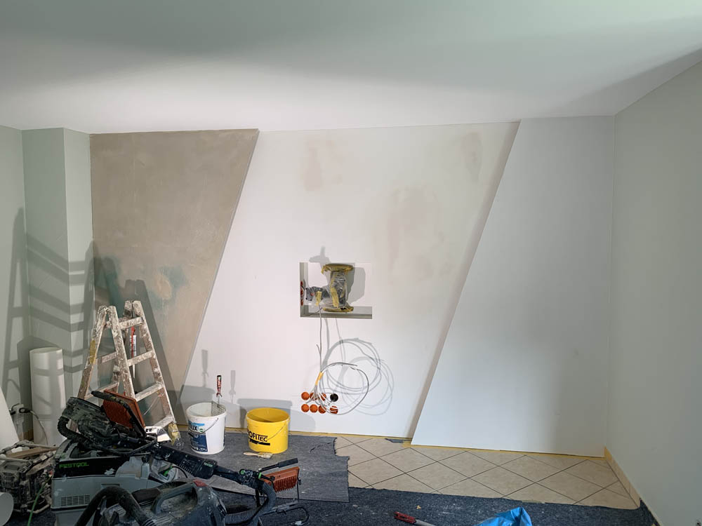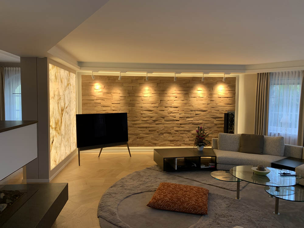 Es wurden Rigipsdecken und Rigipskästen eingebaut, der Kamin wurde rund verputzt und strukturiert, Decken und Wände mit Malervließ tapeziert und mit der Farbe vom Farrow and Ball gestrichen. Der Kunde hat sich als Highlight noch eine Klangwand und mehrere Steinwände verbauen lassen, mit der besonderen Ausleuchtung der Decken und Wände ein einzigartiges Raumgefühl geschaffen.
