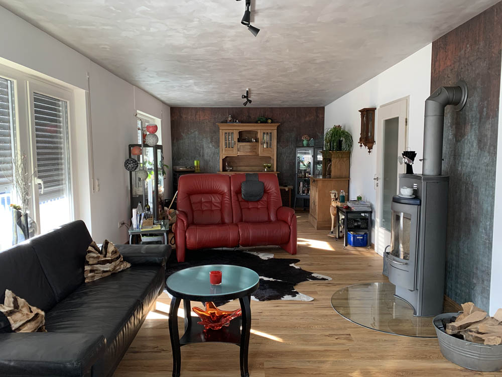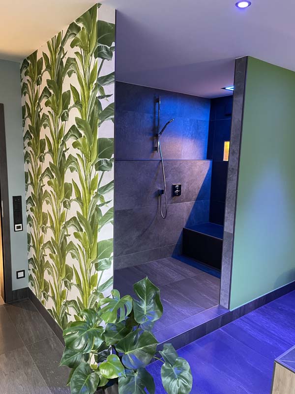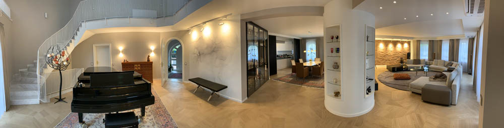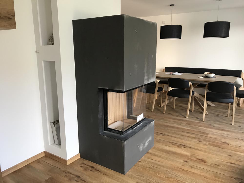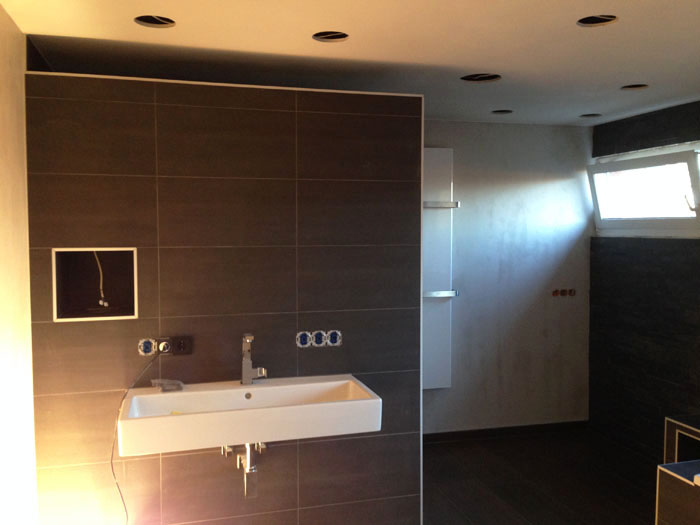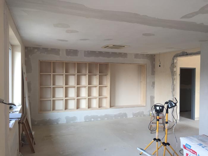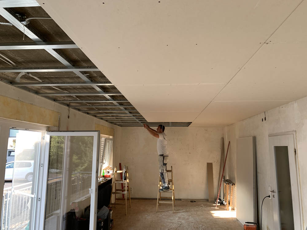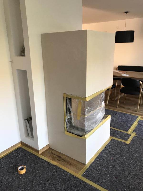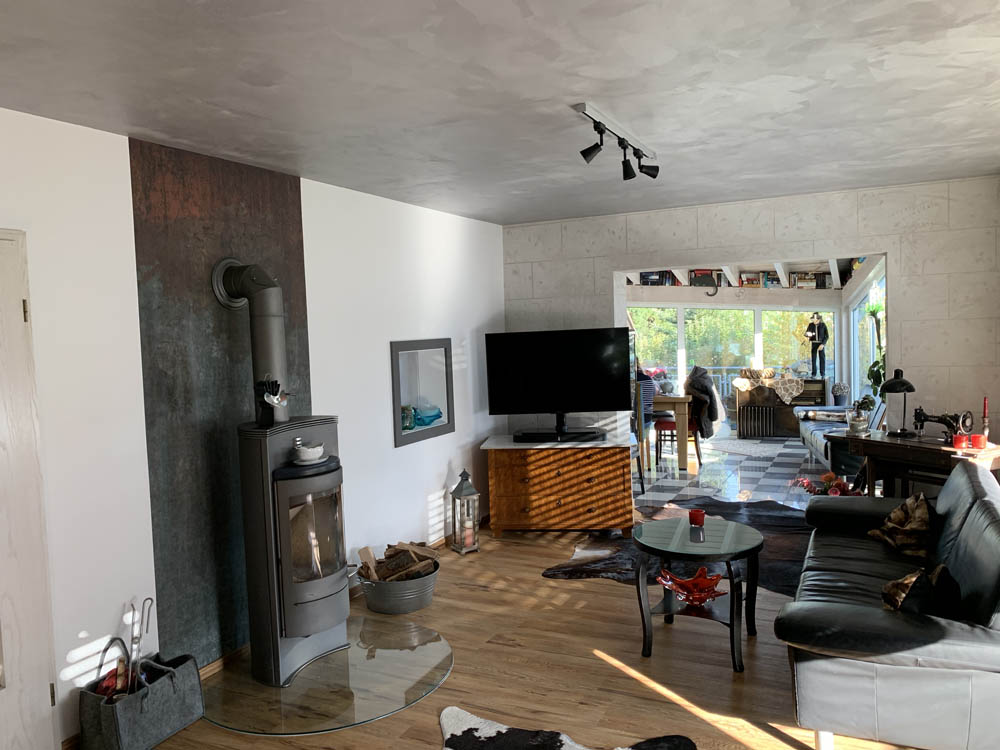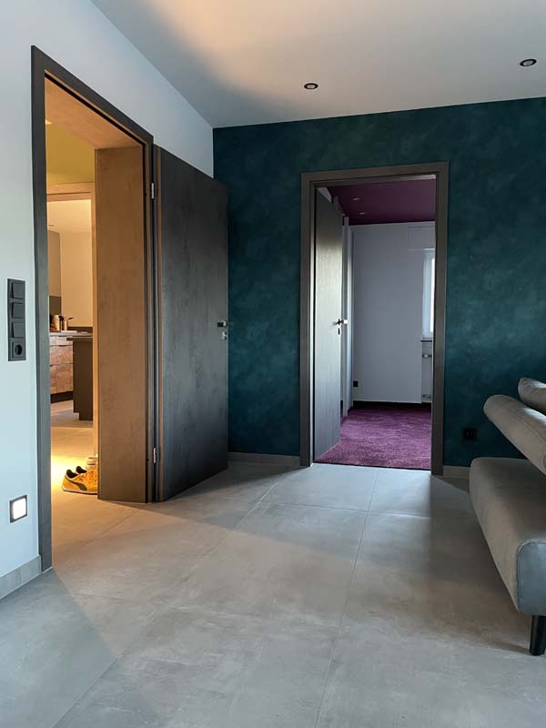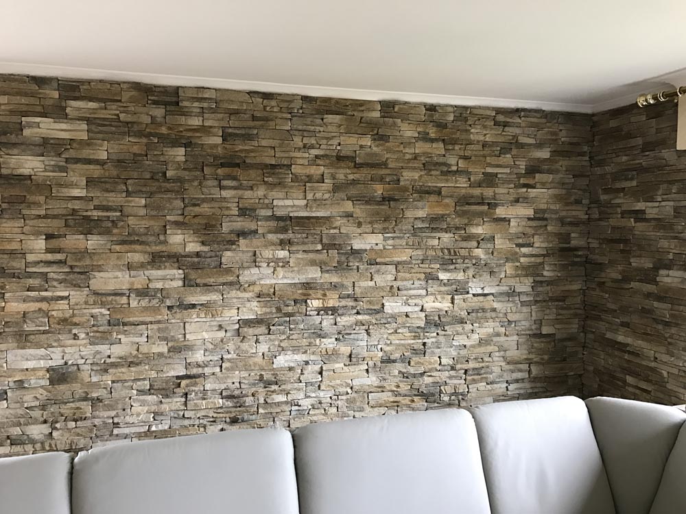 Es wurden Rigipsdecken und Rigipskästen eingebaut, der Kamin wurde rund verputzt und strukturiert, Decken und Wände mit Malervließ tapeziert und mit der Farbe vom Farrow and Ball gestrichen. Der Kunde hat sich als Highlight noch eine Klangwand und mehrere Steinwände verbauen lassen, mit der besonderen Ausleuchtung der Decken und Wände ein einzigartiges Raumgefühl geschaffen.