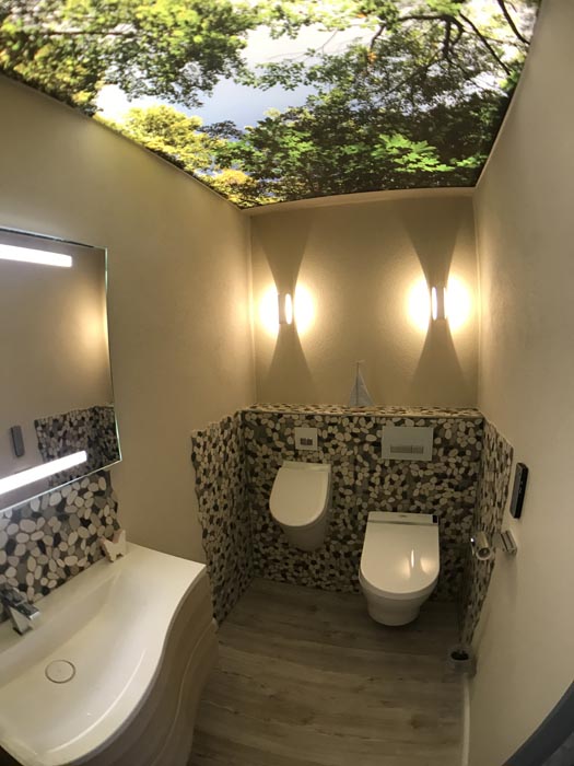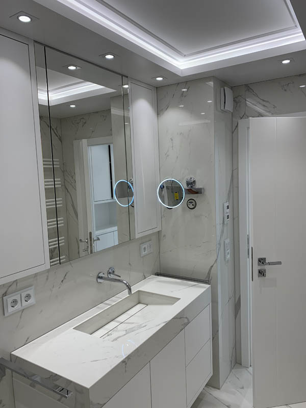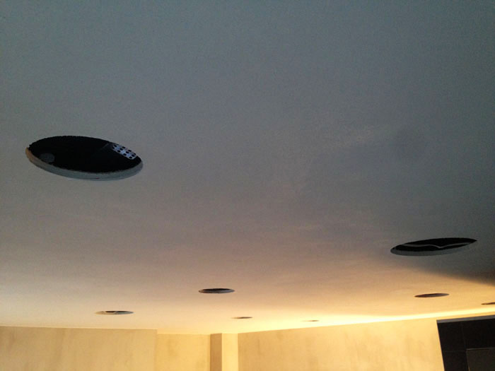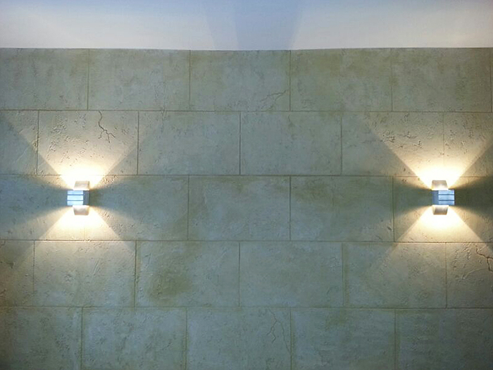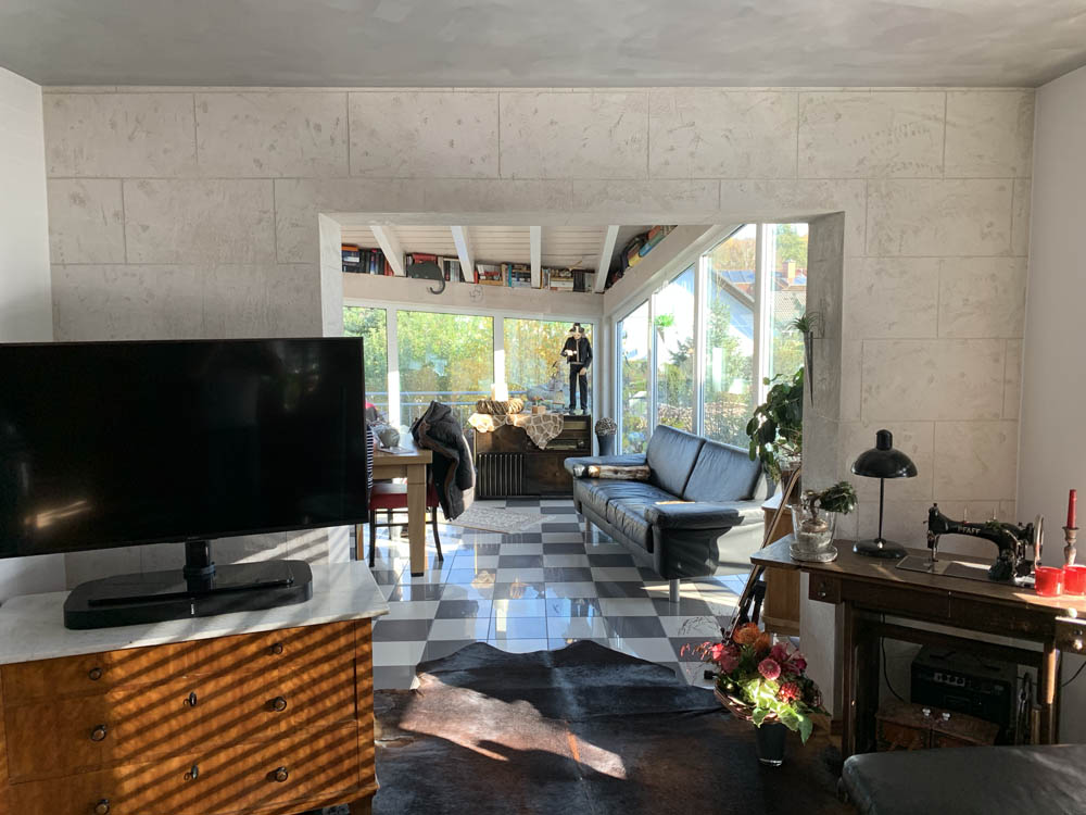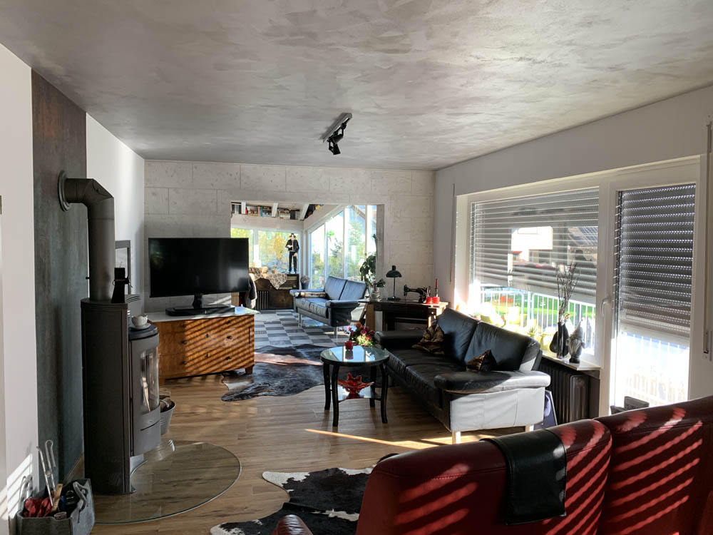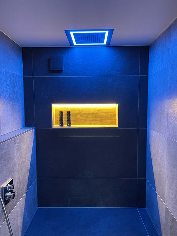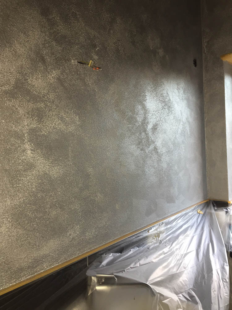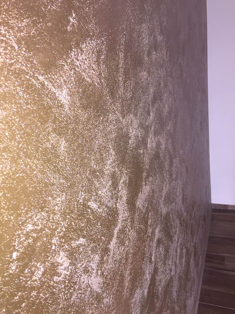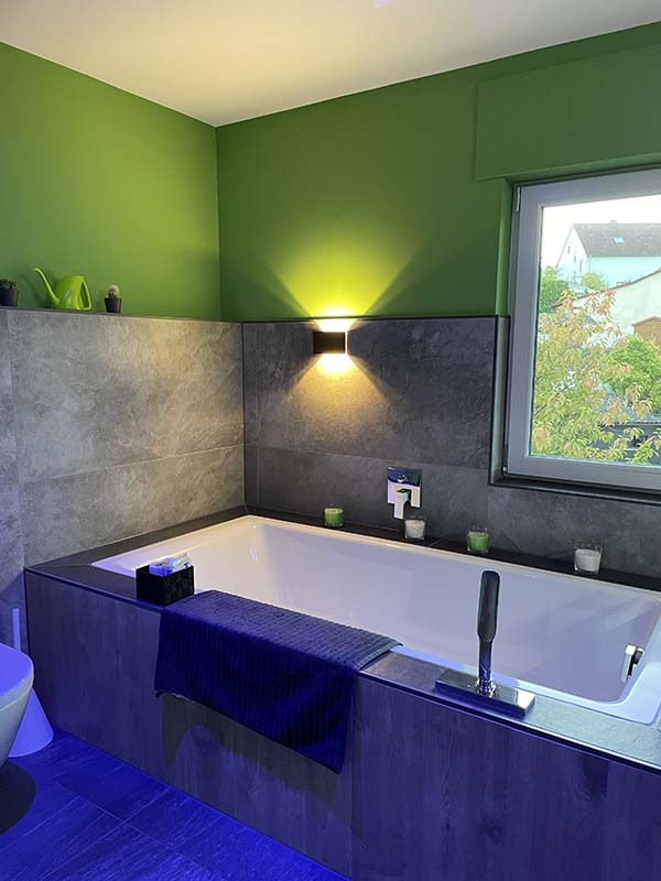 Es wurden Rigipsdecken und Rigipskästen eingebaut, der Kamin wurde rund verputzt und strukturiert, Decken und Wände mit Malervließ tapeziert und mit der Farbe vom Farrow and Ball gestrichen. Der Kunde hat sich als Highlight noch eine Klangwand und mehrere Steinwände verbauen lassen, mit der besonderen Ausleuchtung der Decken und Wände ein einzigartiges Raumgefühl geschaffen.