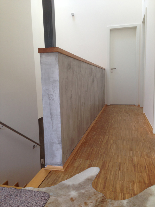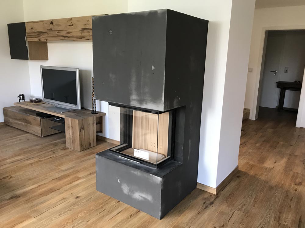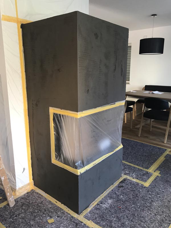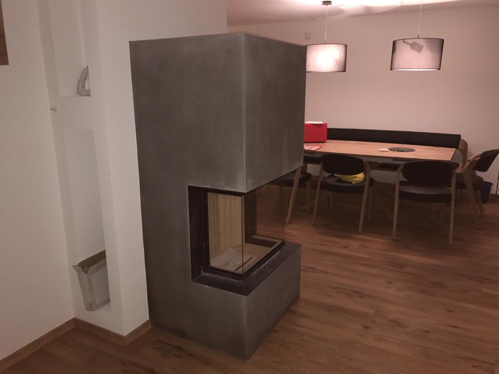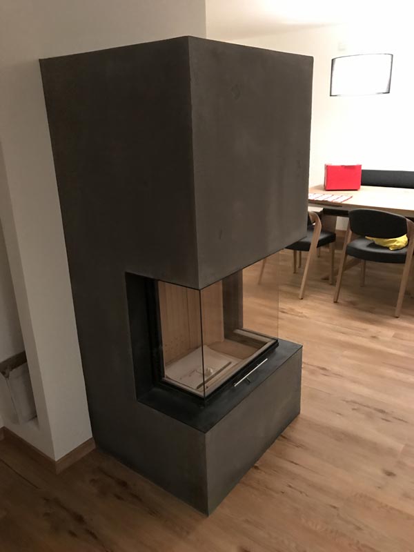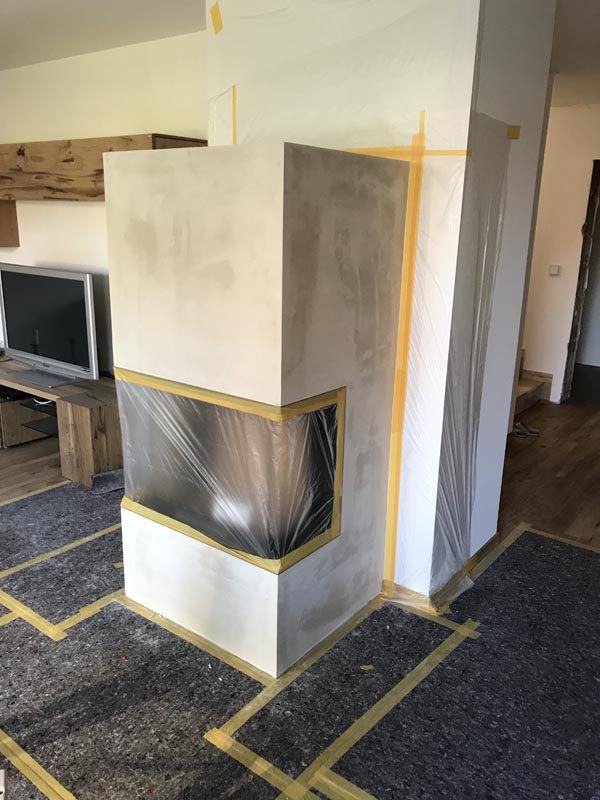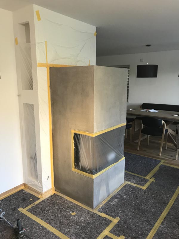 Der Kamin wurde mit einer Betonimitationstechnik beschichtet. Mit einem Werkzeug wurden die charakteristischen Merkmale einer Betonoberfläche eingearbeitet.