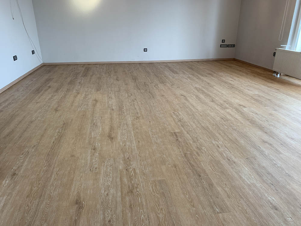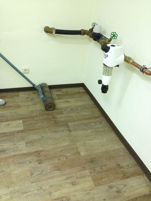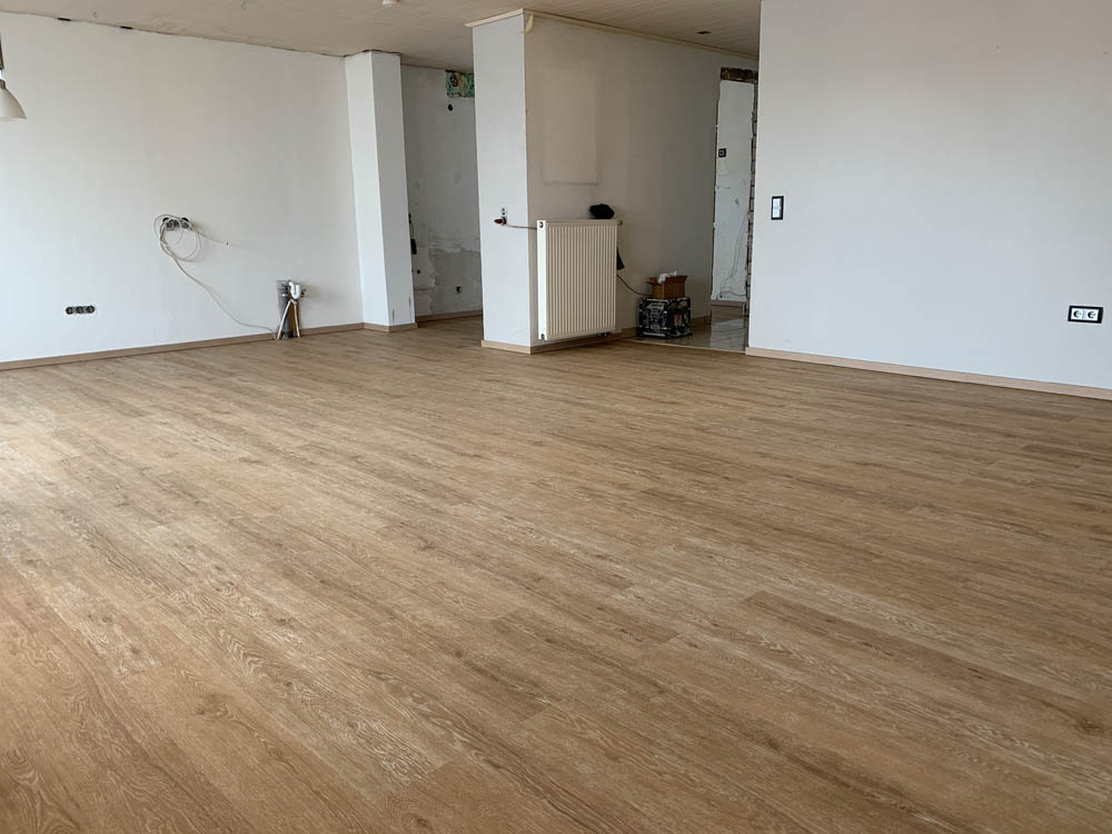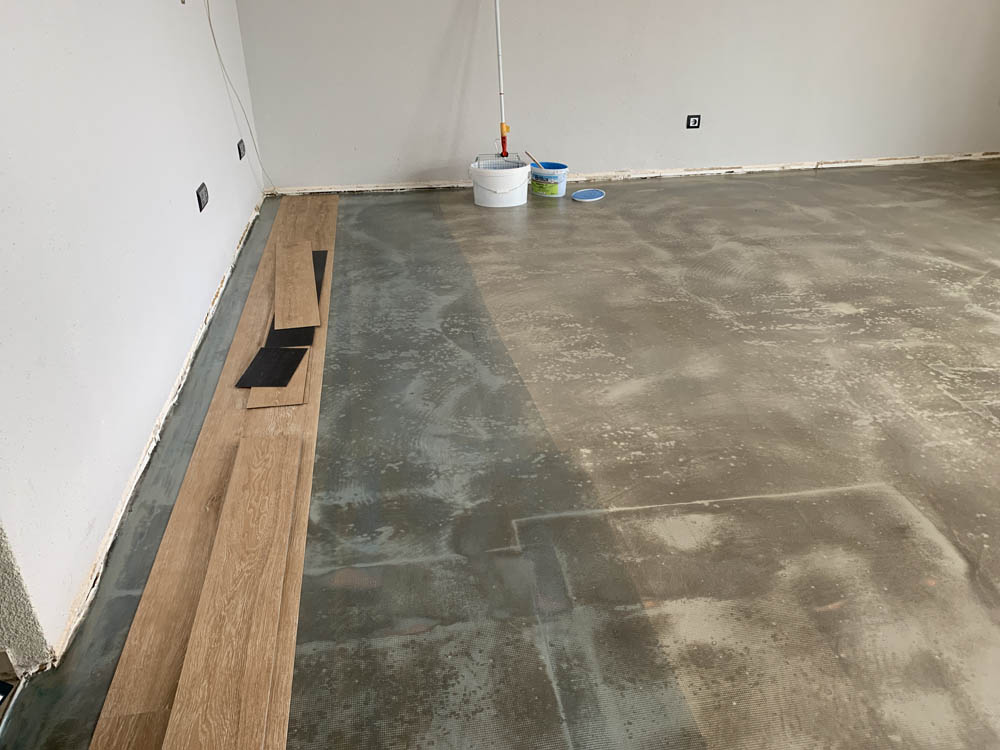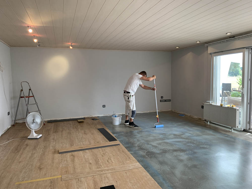 In dem Video und auf den Fotos ist die Vorbereitung und Verlegearbeit des Designbodens zu sehen.
