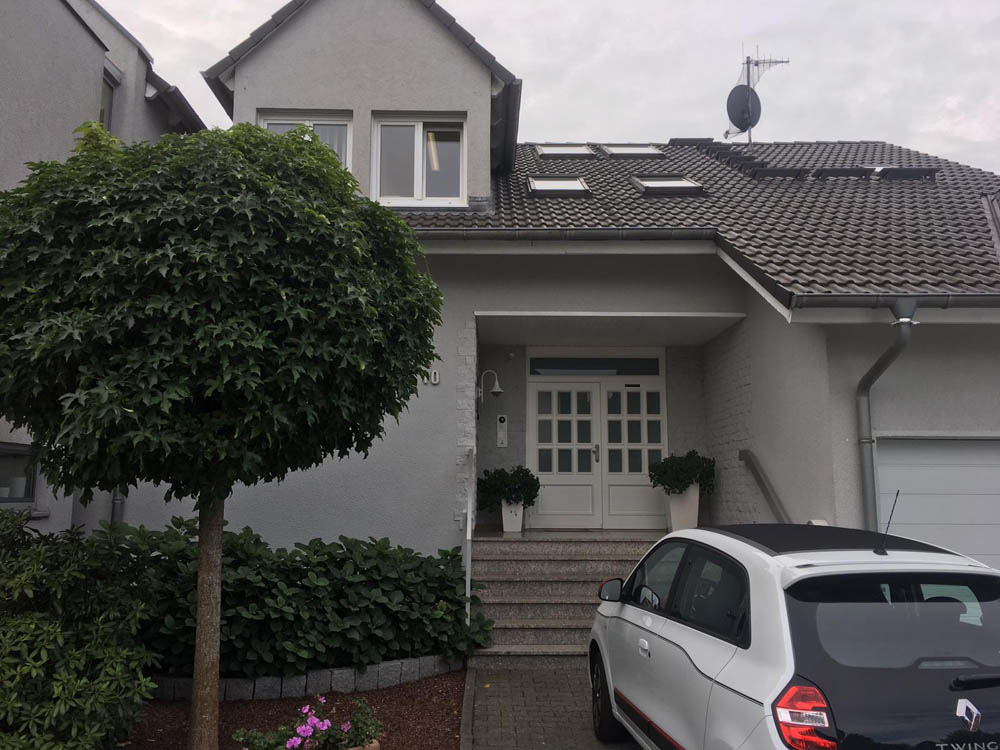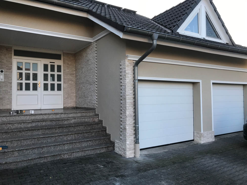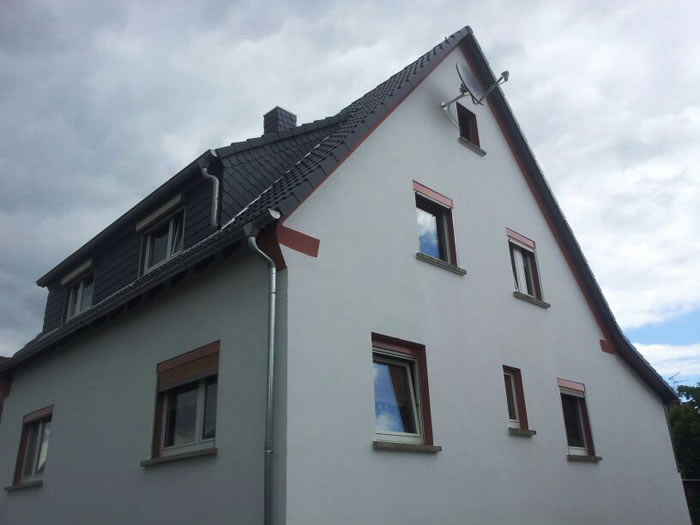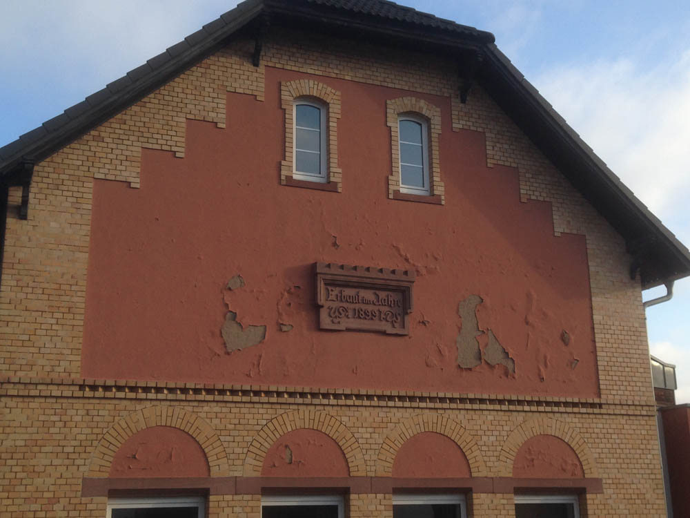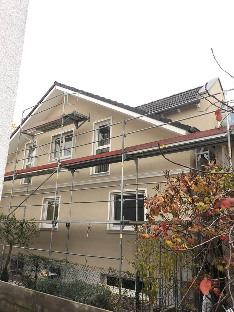 Der alte Klinkersockel wurde komplett abgeschlagen, neu verputzt und neu geklinkert. An der Fassade wurden neue, rundum laufende Stuckelemente an den Fenstern und Ringanker eingearbeitet, versiegelt und weiß gestrichen. Die restliche Fassade wurde in einem dazu passenden Farbton grundiert und gestrichen. Das Holzgesims wurde geschliffen und mit einer Wetterschutzfarbe mehrfach weiß lackiert.