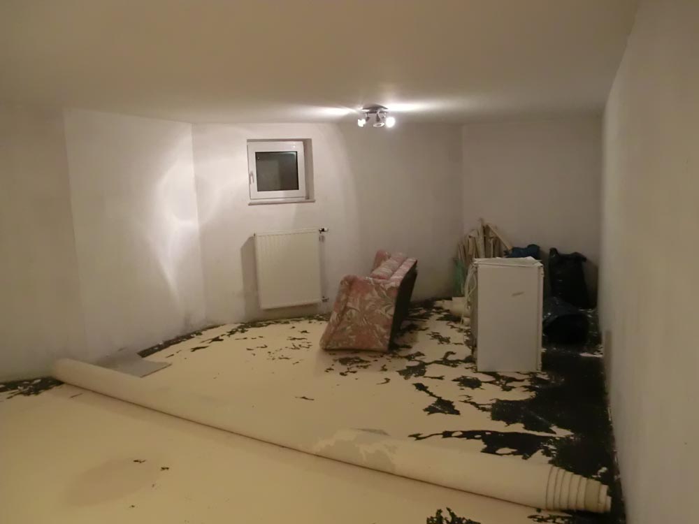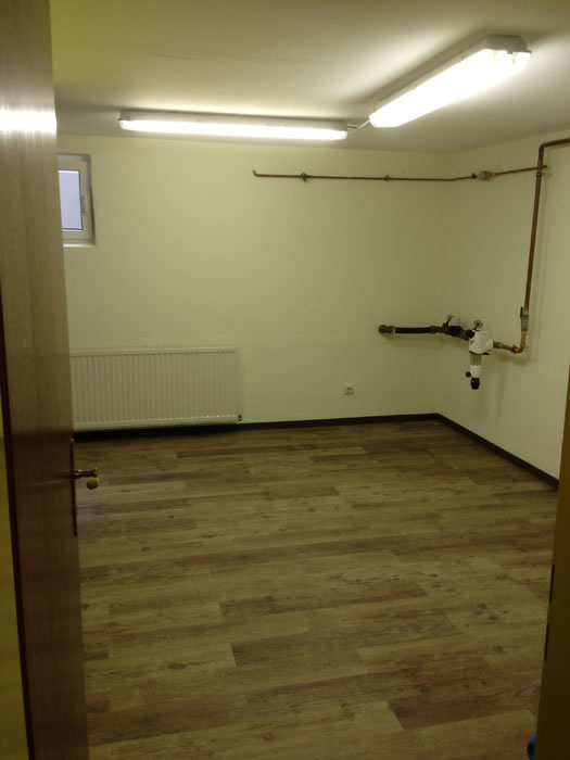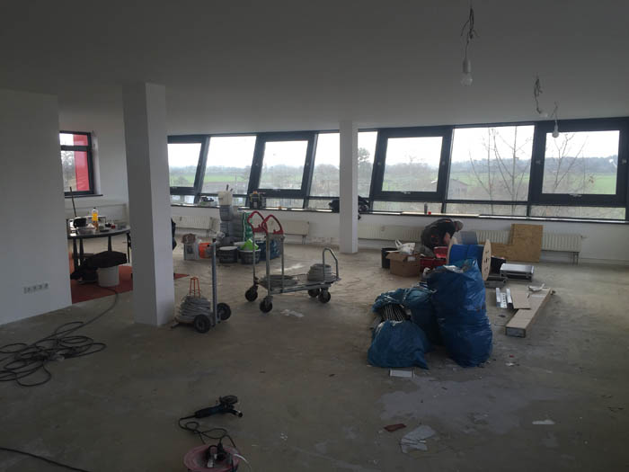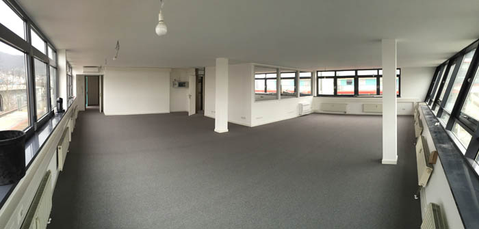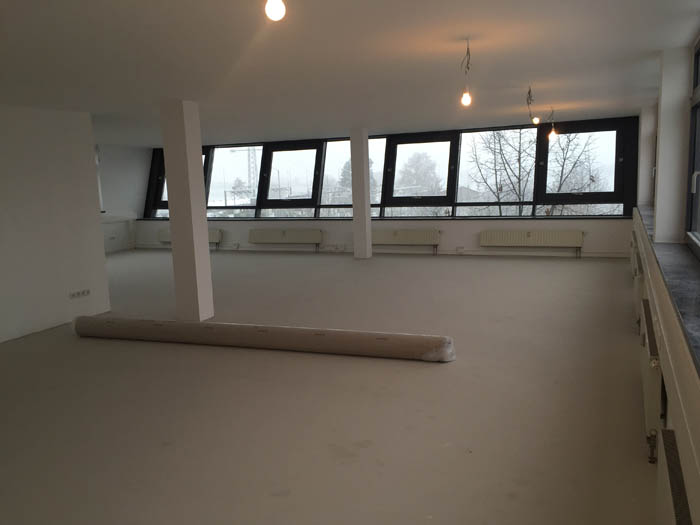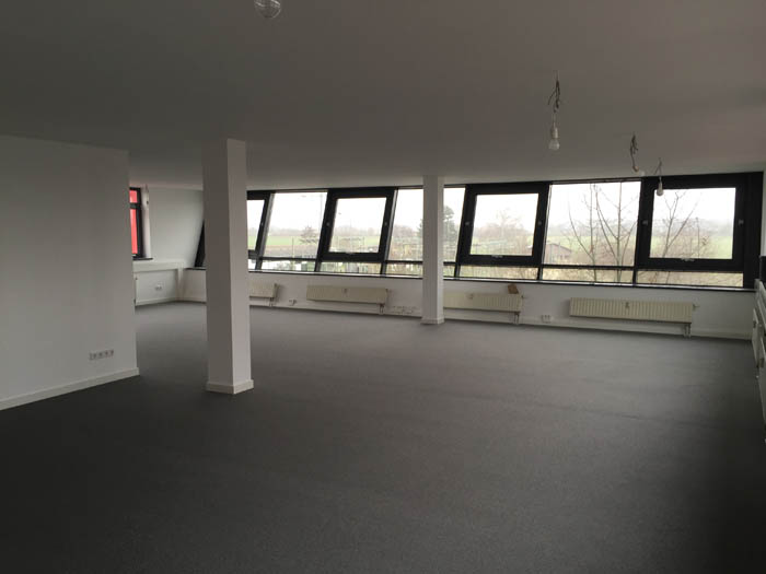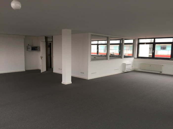 In diesem Büro wurde der alte Bodenbelag entfernt, anschließend wurden die Wände gestrichen, der Boden abgeschliffen, neu abgespachtelt und ein neuer Teppichboden verlegt.