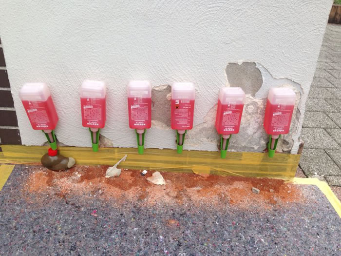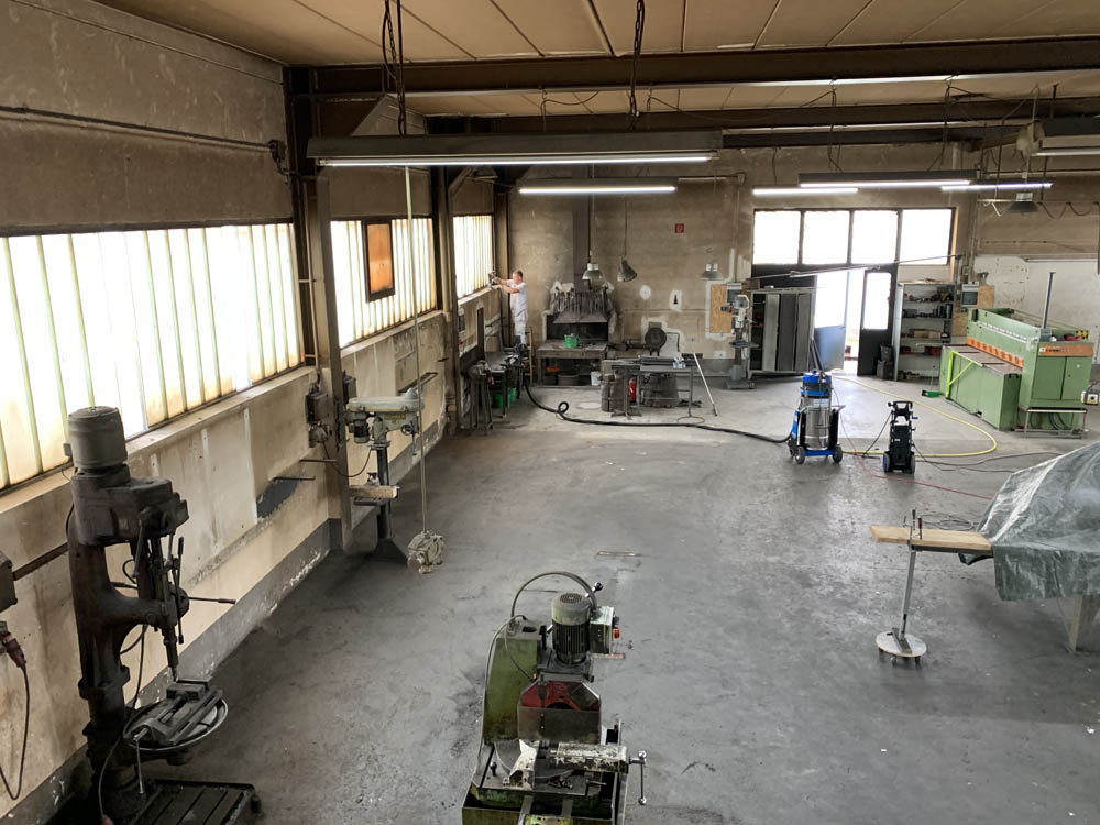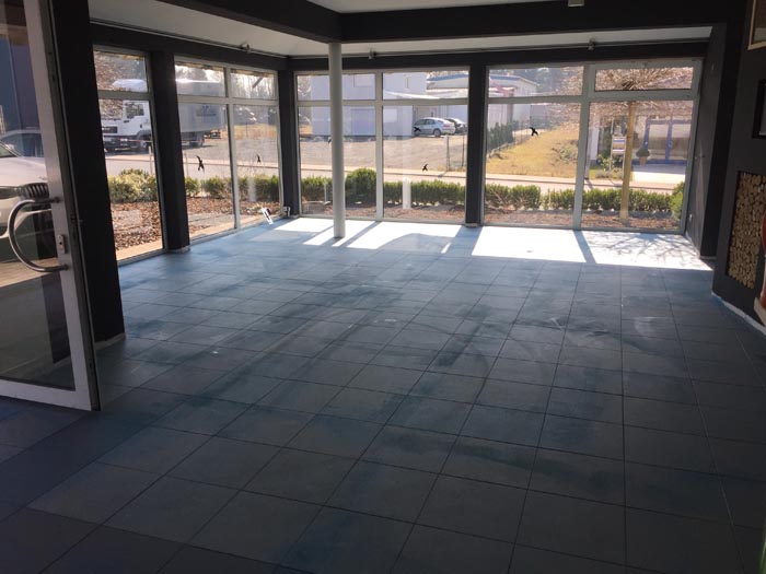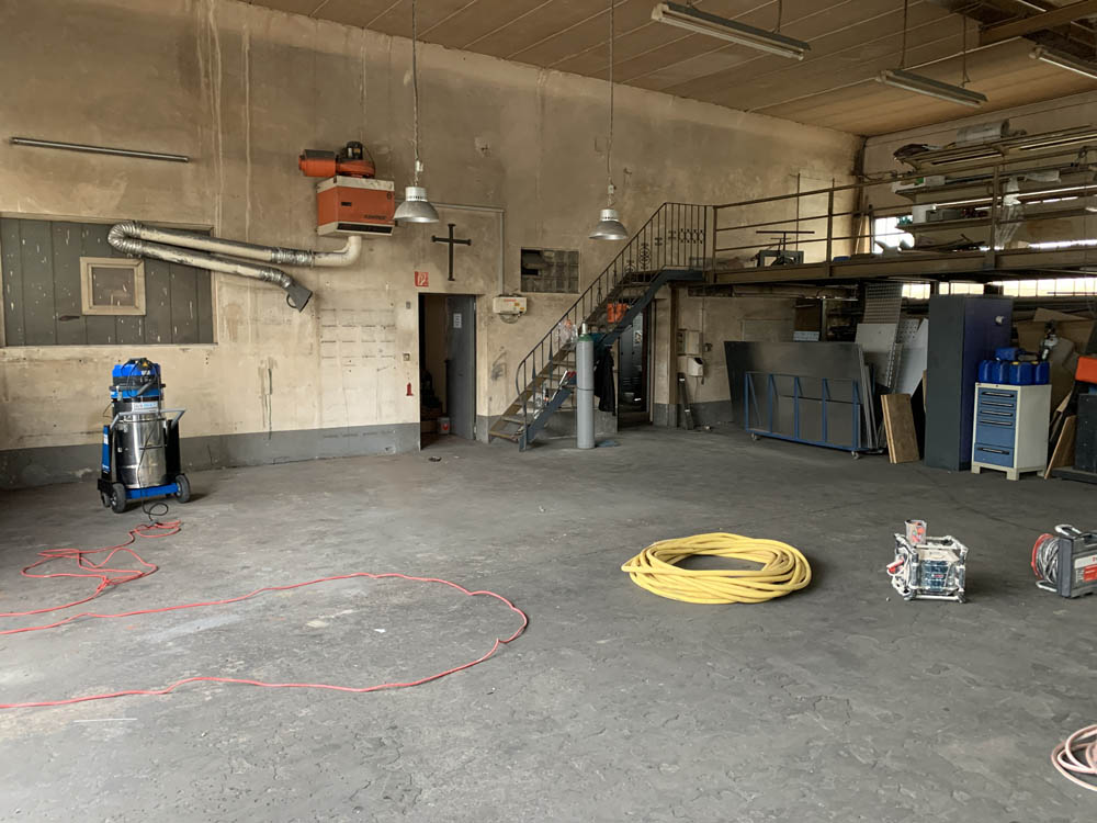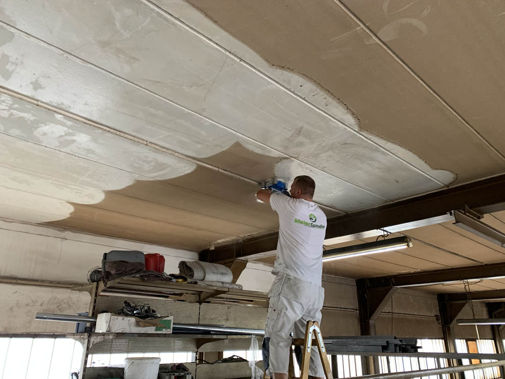 Auf den Fotos ist die Reinigung und Beschichtung mit einer Spezialfarbe für eine Werkstatt zu sehen.