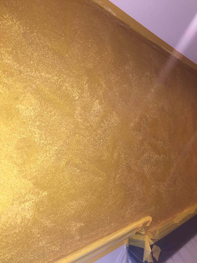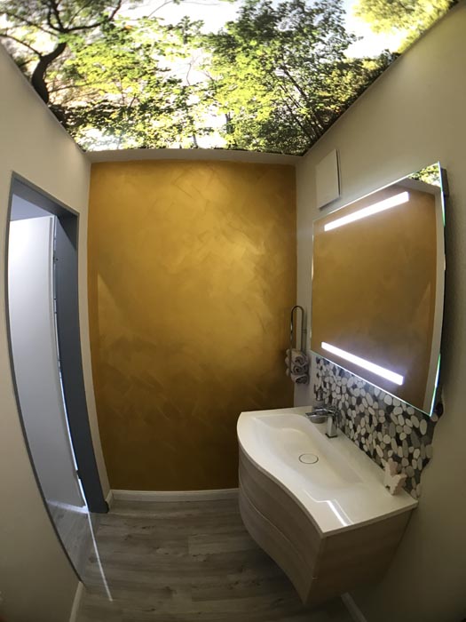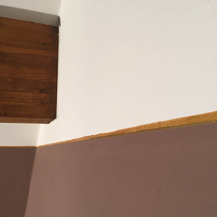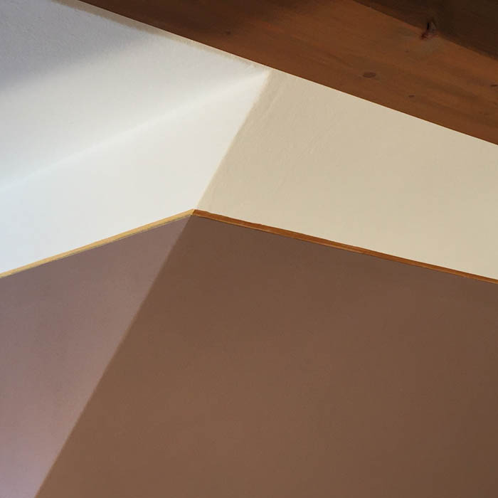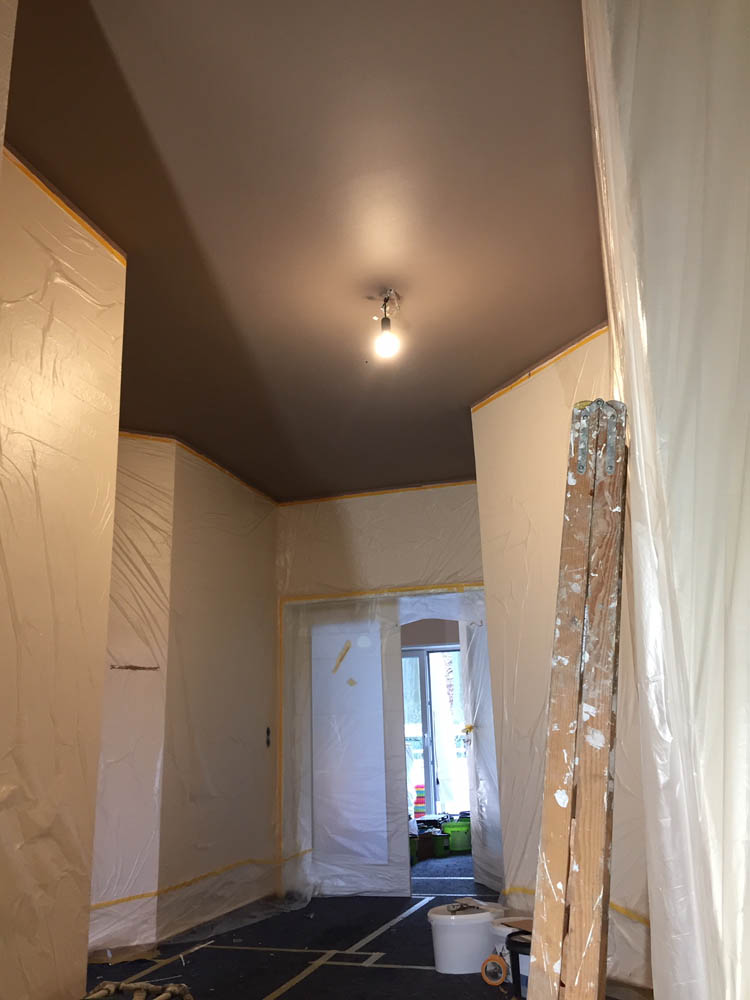 Die Decke und die Wände wurden mit einer Lehmfarbe der Firma Lesando deckend zweifarbig gestrichen und ein Akzentstreifen mit dem Strichzieher in Gold eingearbeitet.