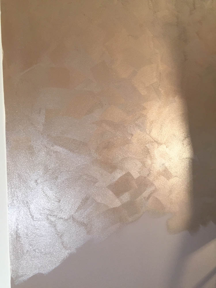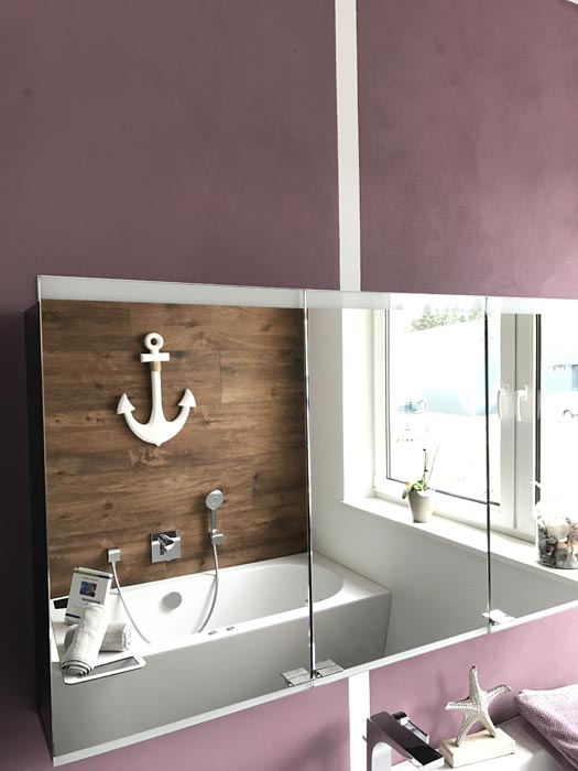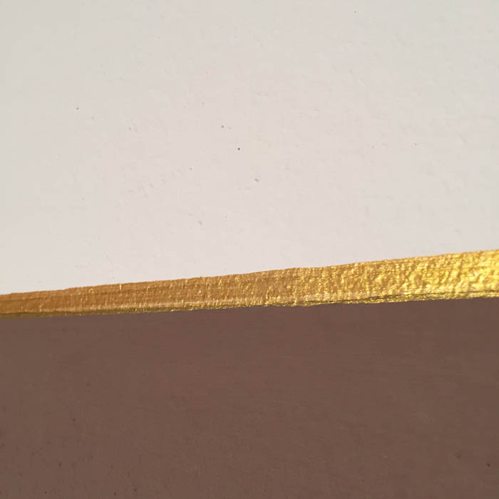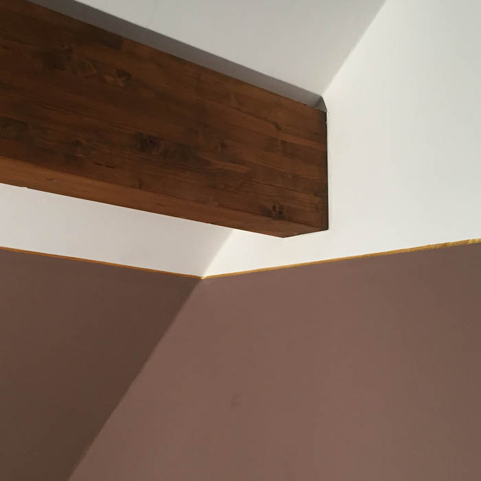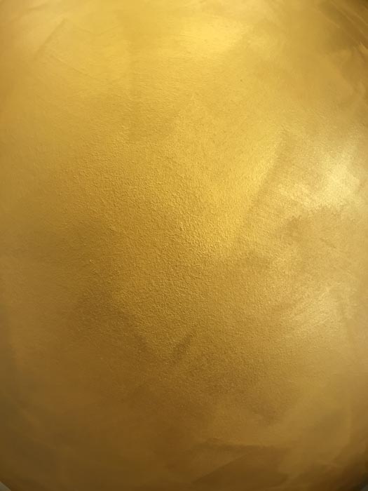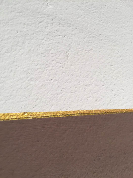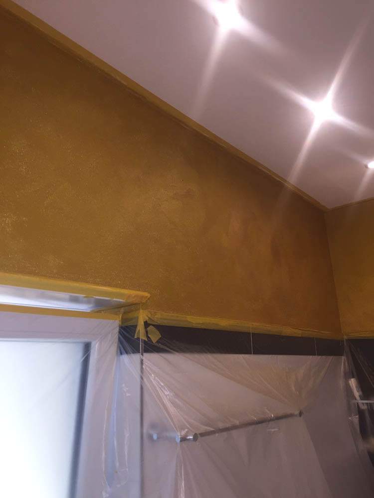 Die Decke und die Wände wurden mit einer Lehmfarbe der Firma Lesando deckend zweifarbig gestrichen und ein Akzentstreifen mit dem Strichzieher in Gold eingearbeitet.