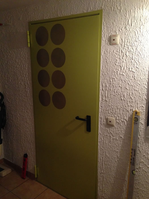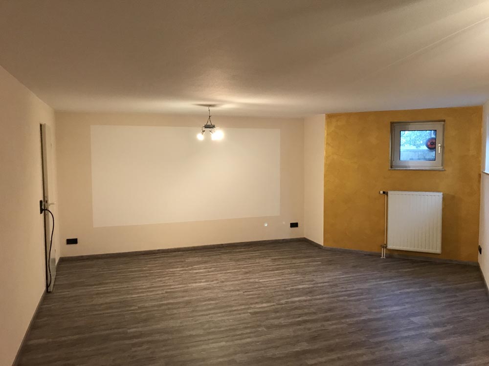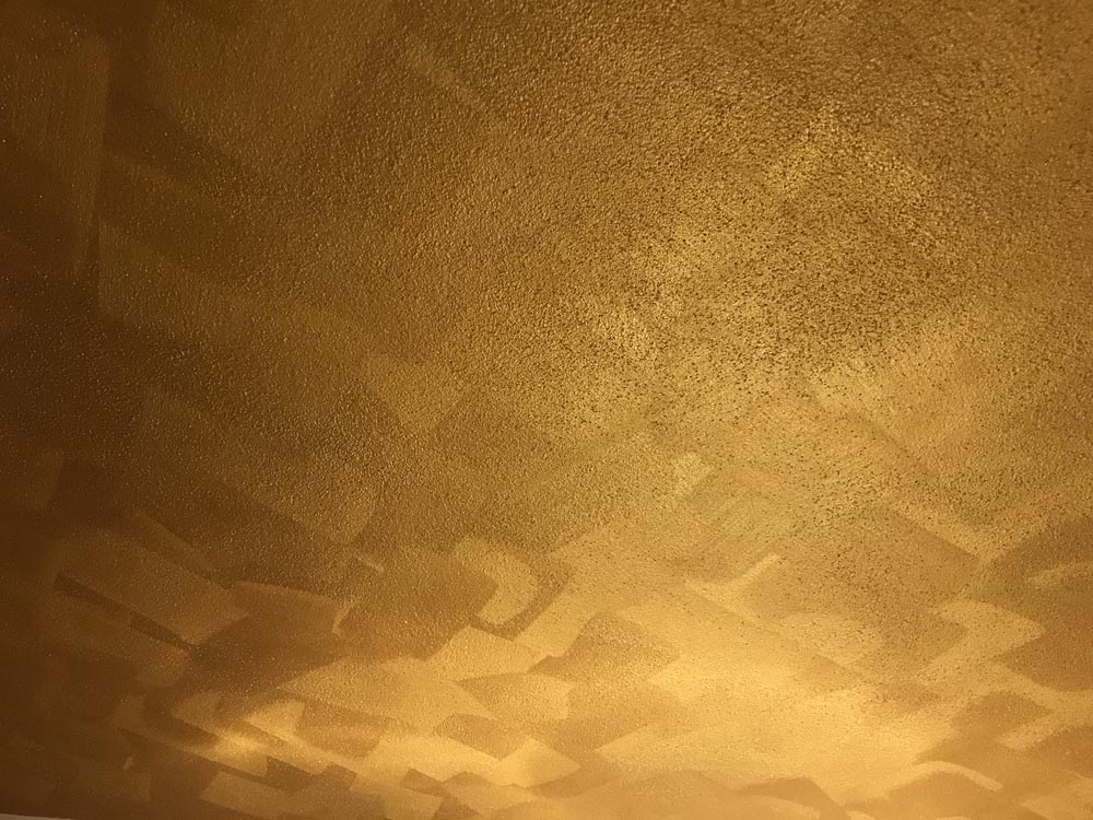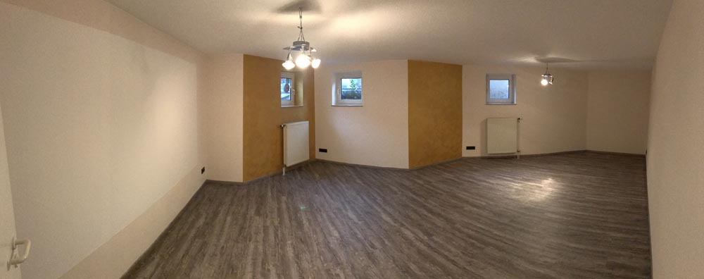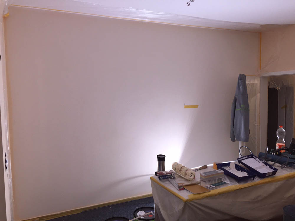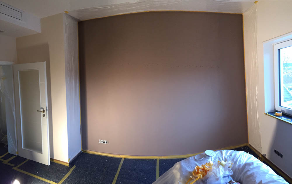 Es wurde der alte Teppichboden und die Tapeten an den Wänden entfernt. Anschließend wurden die Wände neu verputzt und strukturiert, eine glatte Oberfläche geschaffen, um eine Leinwand für einen Beamer zu integrieren. Weiterhin wurde eine Goldimitationstechnik als Blickfang eingearbeitet.