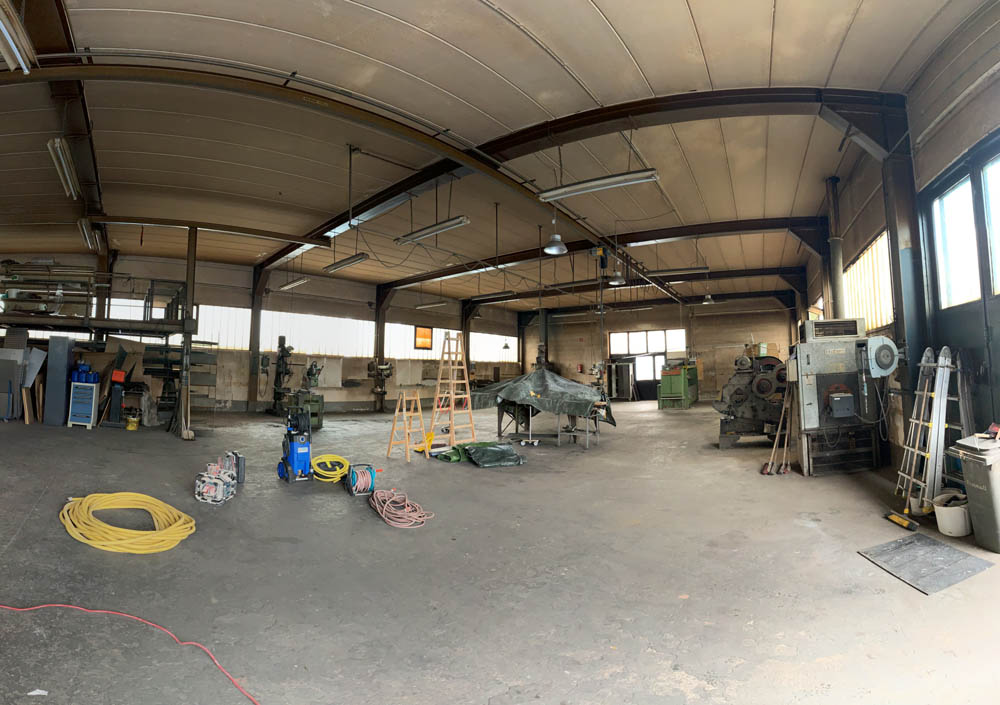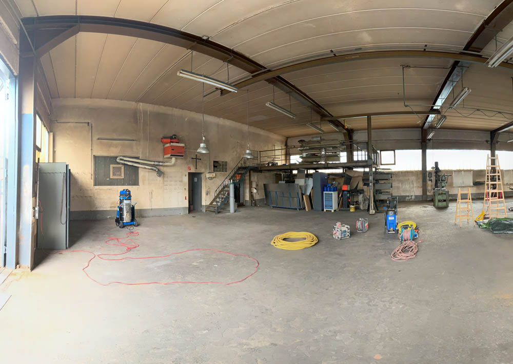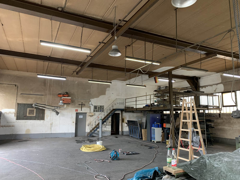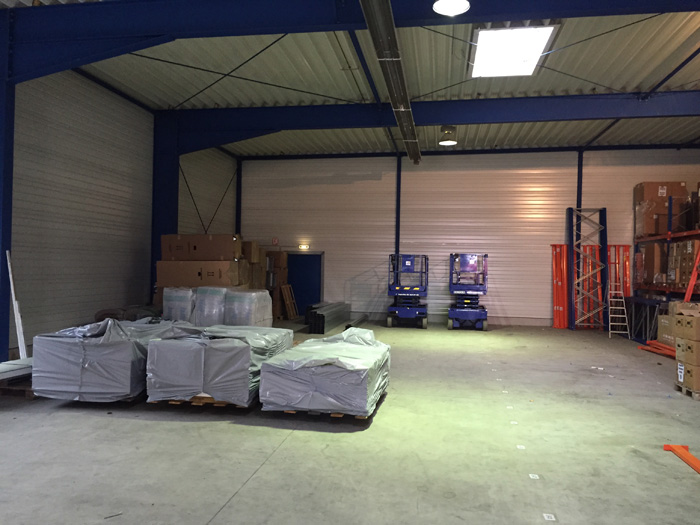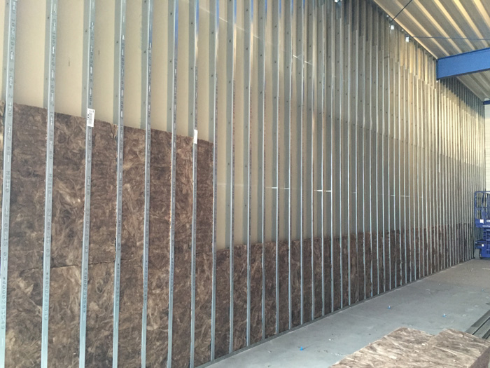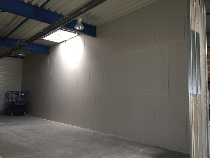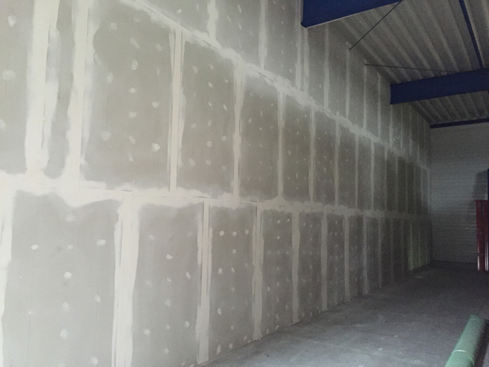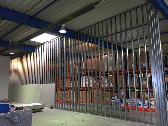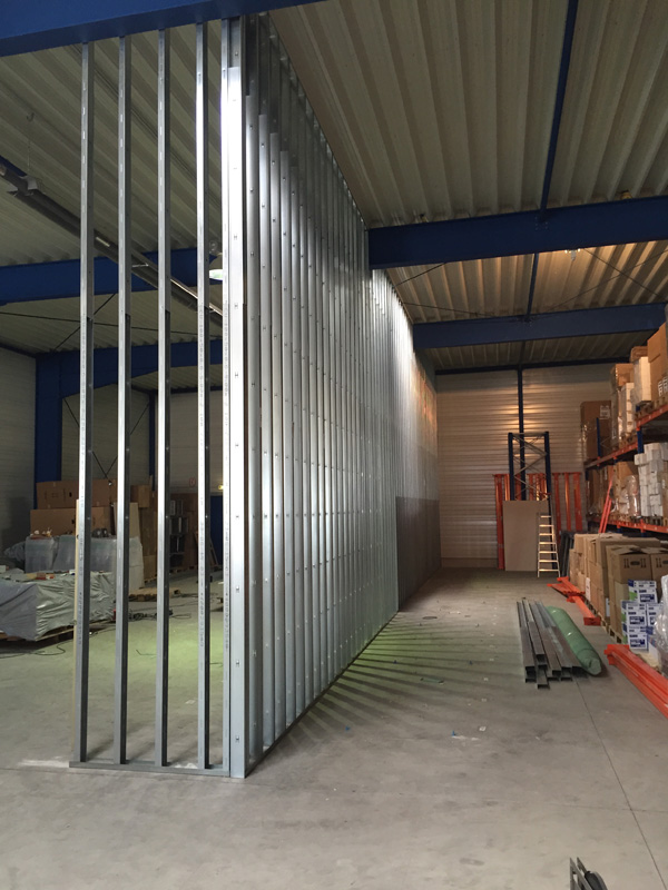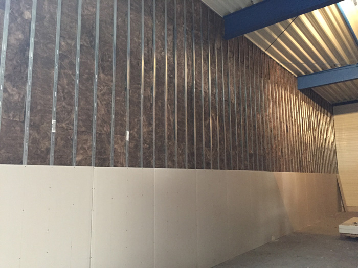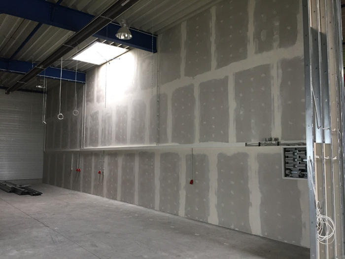 Hier ist eine Lagerhalle zu sehen, die mit einer Rigipswand abgestellt und verkleidet wurde.
