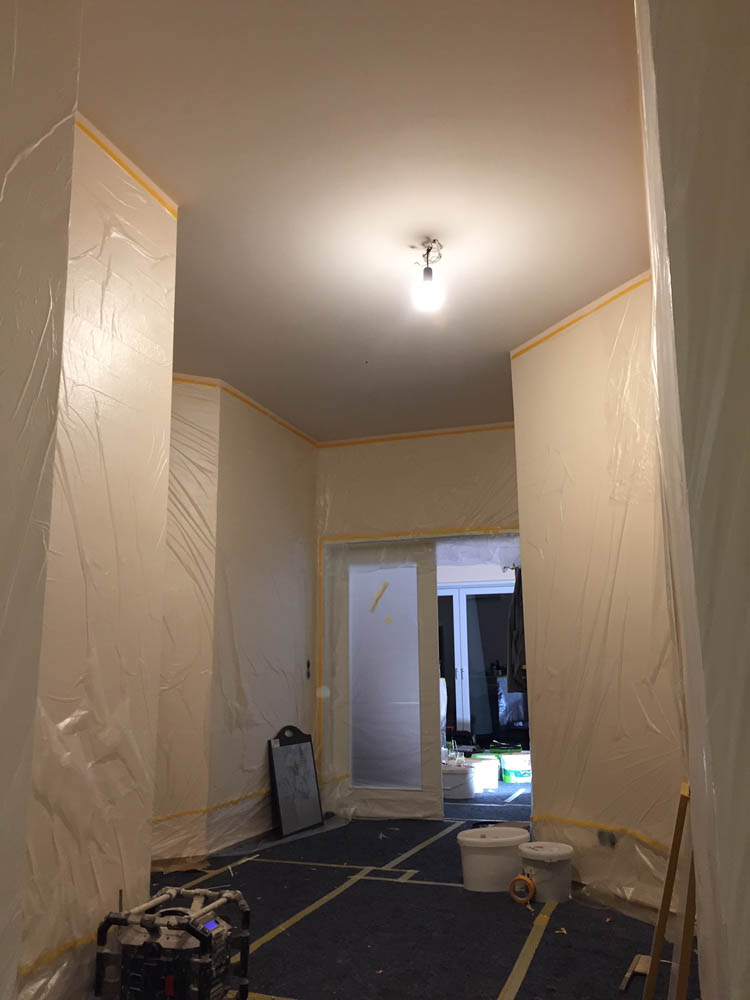 Das Treppenhaus wurde komplett mit Malervlies tapeziert und gestrichen.