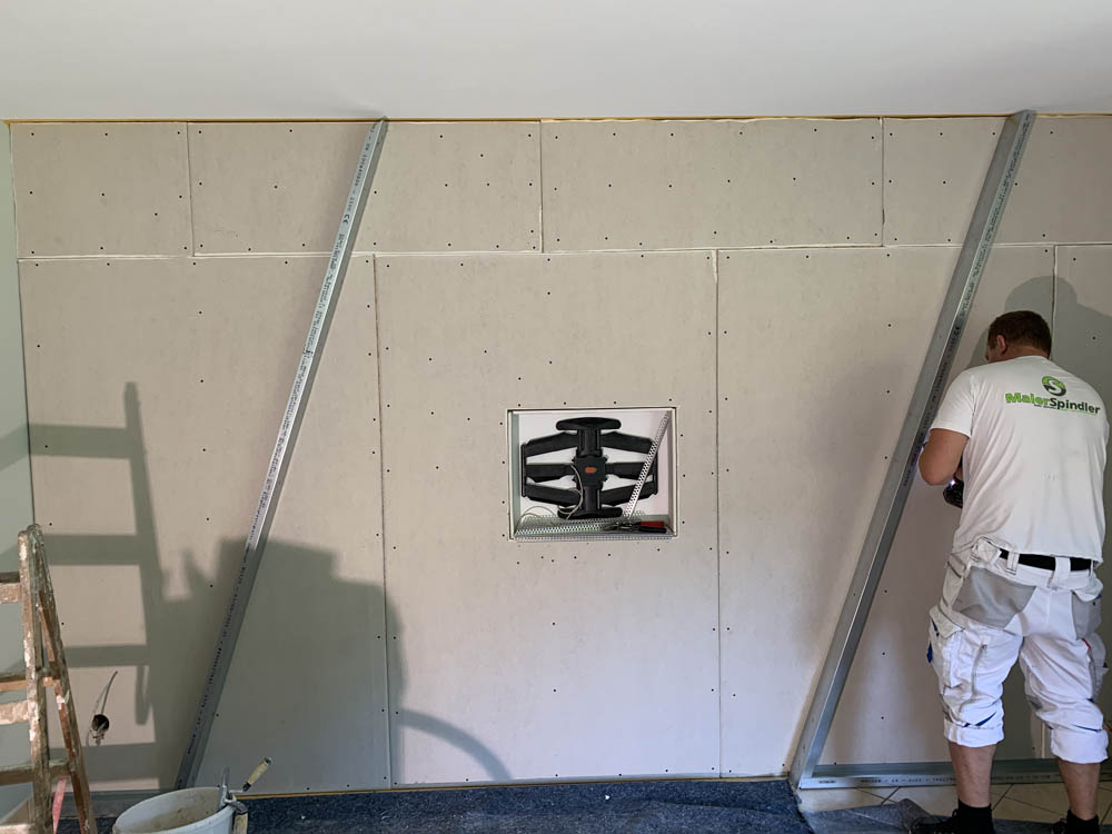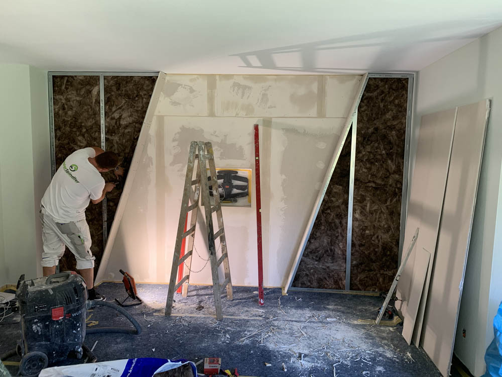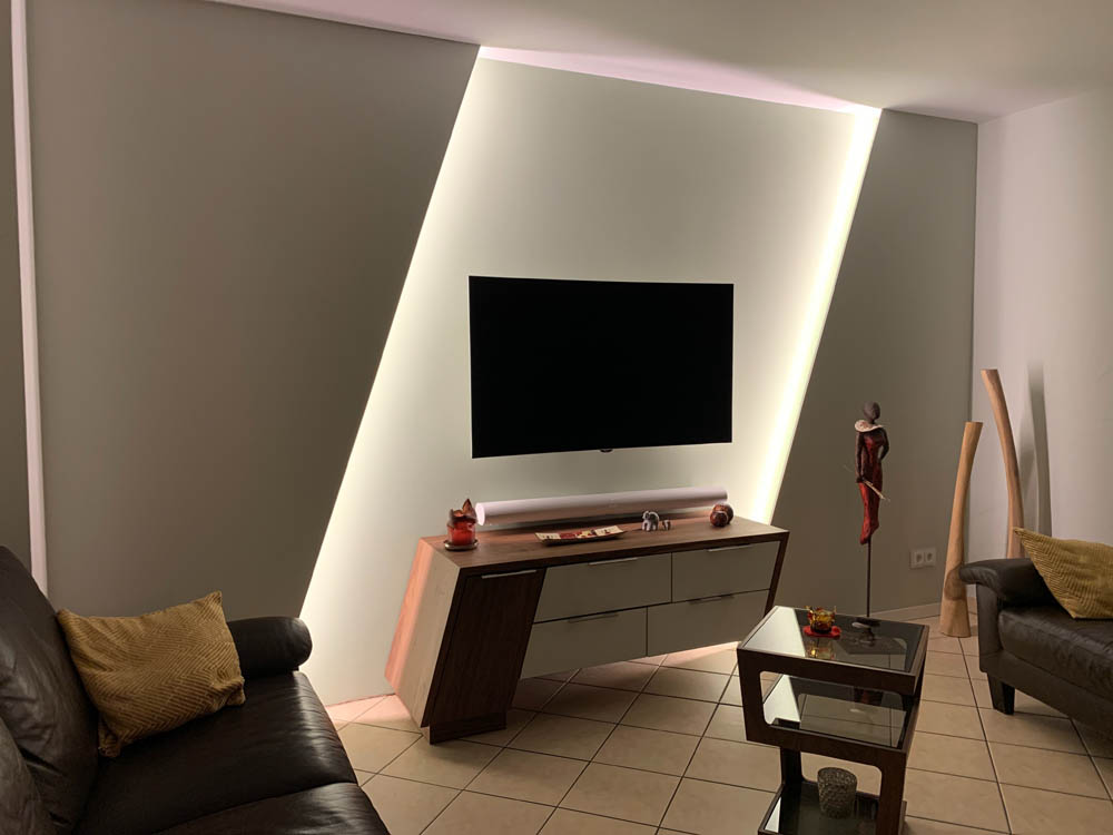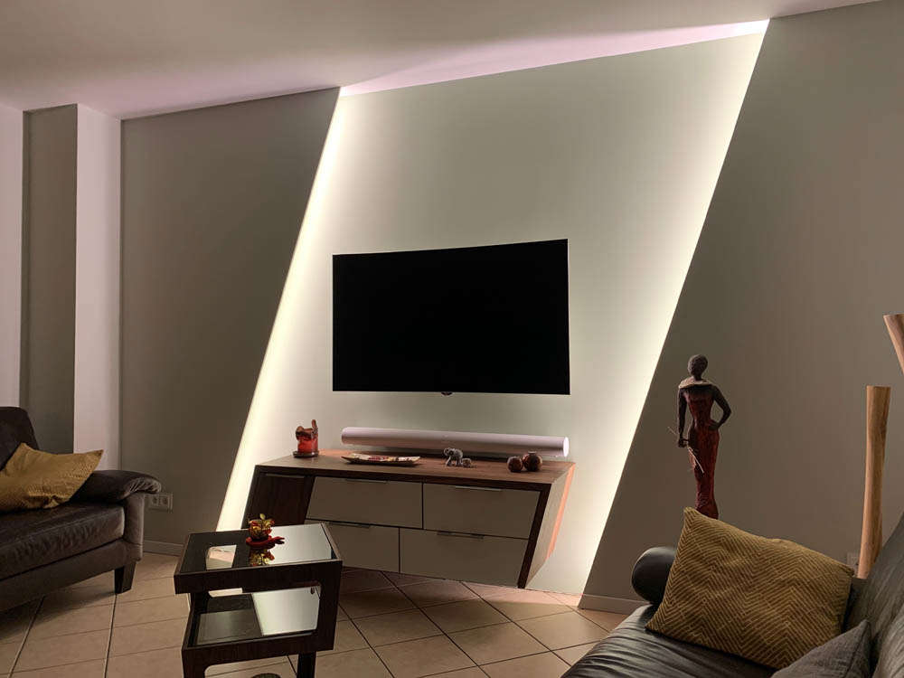 Auf den Fotos sind Rigips- und Dämmarbeiten für eine TV-Wand zu sehen. Die schrägen Designelemente sind mit LED-Lichtbändern hinterleuchtet.