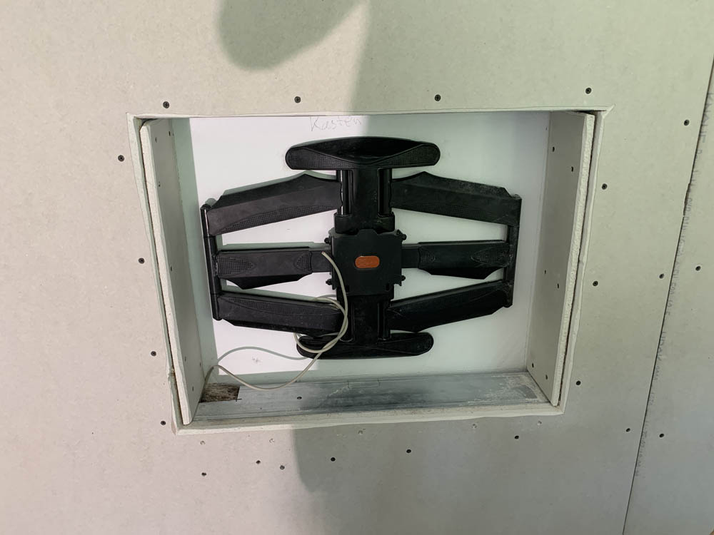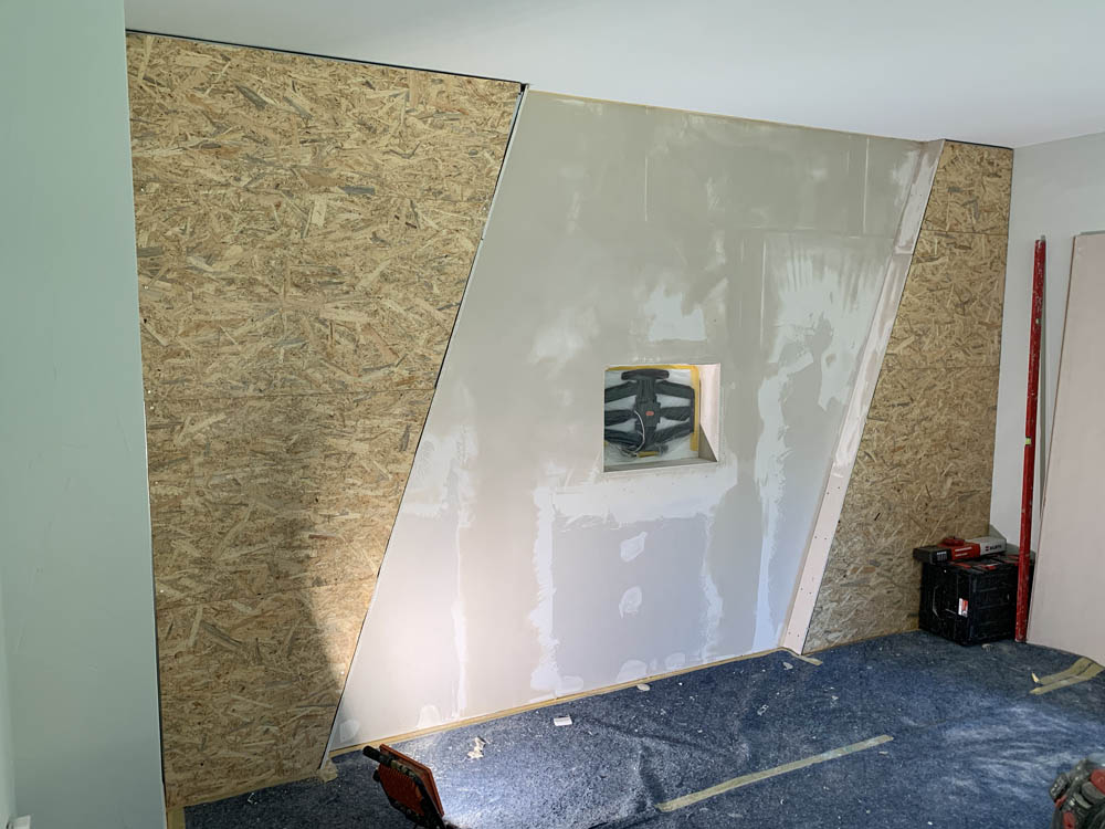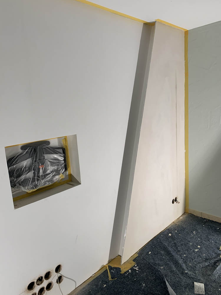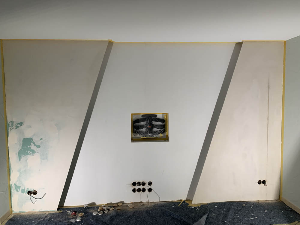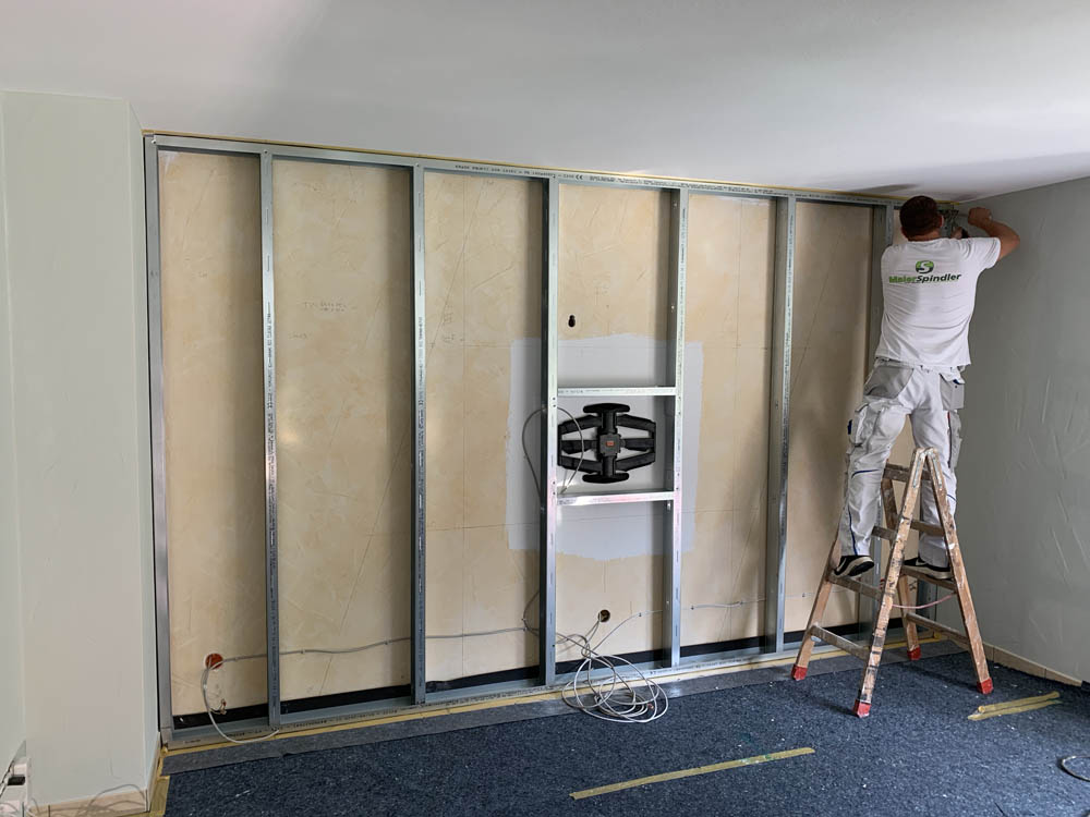 Auf den Fotos sind Rigips- und Dämmarbeiten für eine TV-Wand zu sehen. Die schrägen Designelemente sind mit LED-Lichtbändern hinterleuchtet.